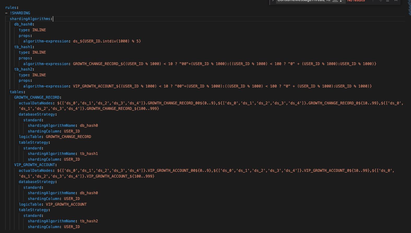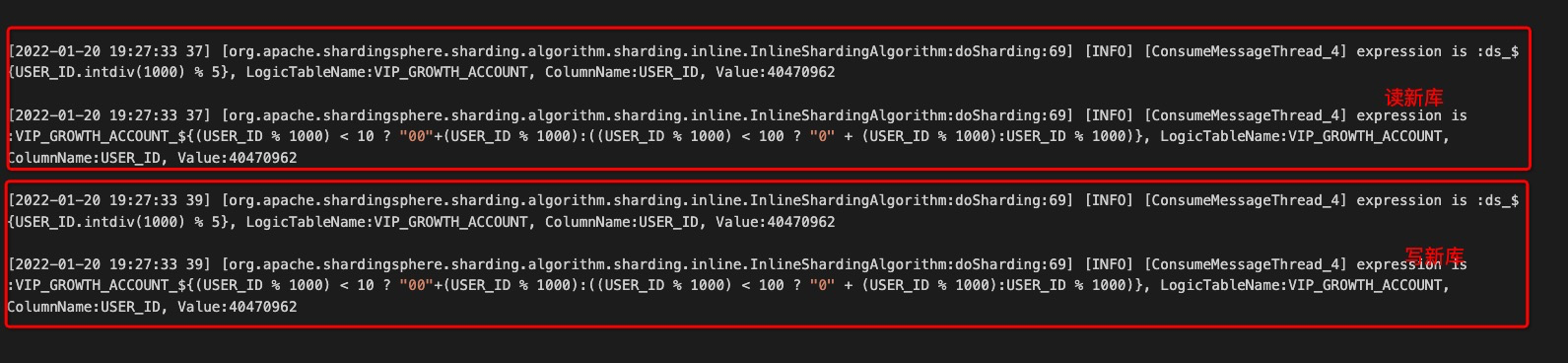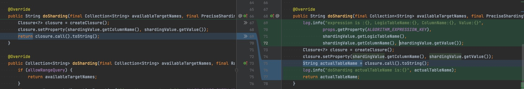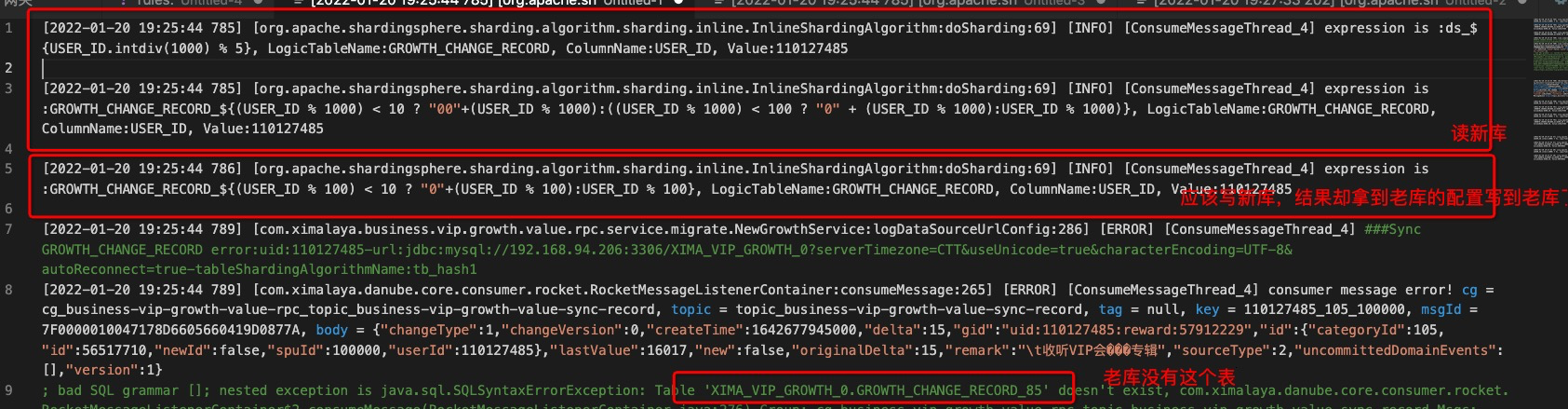 there are two datasources used in our project. old datasource's configuration is, only shards tables, do NOT shards database:  new datasource's configuration is, we shards both databases and tables:  The datasources are:  We use the two datasources by extending spring AbstractRoutingDataSource ``` public class DynamicDataSource extends AbstractRoutingDataSource { @Override protected Object determineCurrentLookupKey() { return DynamicDataSourceHolder.getDataSource(); } } ``` DynamicDataSourceHolder uses ThreadLocal to choose either old datasource or new datasource. We read the new datasource first and then write into new datasource by multithreading, as the following:  But sometimes, we find that it wrote to the old dataSource! For convenience, we added some logs in InlineShardingAlgorithm:  The logs are:  First, we found the new datasource's sharding rules, but then, when we wrote, we unexpectedly found the old datasource sharding rules, so we failed to write data! And then, we execute the code again, the we succeed!  We counted it, about 100,000 executions will report an error once, Does anyone know why? -- This is an automated message from the Apache Git Service. To respond to the message, please log on to GitHub and use the URL above to go to the specific comment. To unsubscribe, e-mail: [email protected] For queries about this service, please contact Infrastructure at: [email protected]