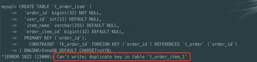 ## Bug Report ### Which version of ShardingSphere did you use? - 5.1.0 ### Which project did you use? ShardingSphere-JDBC or ShardingSphere-Proxy? - ShardingSphere-Proxy ### Expected behavior  Successfully created a table . ### Actual behavior  Create a table failed. ### Reason analyze (If you can) The foreign key in a database in mysql cannot be repeated, When generating SQL execution statements, there is not rewrite foreign key name. ### Steps to reproduce the behavior, such as: SQL to execute, sharding rule configuration, when exception occur etc. 1. add rules ```yaml ds_0: url: jdbc:mysql://localhost:3306/demo_ds_0?serverTimezone=UTC&useSSL=false username: root password: servyou connectionTimeoutMilliseconds: 30000 idleTimeoutMilliseconds: 60000 maxLifetimeMilliseconds: 1800000 maxPoolSize: 50 minPoolSize: 1 dataSourceClassName: com.zaxxer.hikari.HikariDataSource ds_1: url: jdbc:mysql://localhost:3306/demo_ds_1?serverTimezone=UTC&useSSL=false username: root password: servyou connectionTimeoutMilliseconds: 30000 idleTimeoutMilliseconds: 60000 maxLifetimeMilliseconds: 1800000 maxPoolSize: 50 minPoolSize: 1 dataSourceClassName: com.zaxxer.hikari.HikariDataSource ``` ```yaml - !SHARDING bindingTables: - t_order,t_order_item defaultDatabaseStrategy: standard: shardingAlgorithmName: database_inline shardingColumn: user_id defaultTableStrategy: none: '' keyGenerators: snowflake: type: SNOWFLAKE shardingAlgorithms: database_inline: props: algorithm-expression: ds_${user_id % 2} type: INLINE t_order_inline: props: algorithm-expression: t_order_${order_id % 2} type: INLINE t_order_item_inline: props: algorithm-expression: t_order_item_${order_id % 2} type: INLINE tables: t_order: actualDataNodes: ds_${0..1}.t_order_${0..1} keyGenerateStrategy: column: order_id keyGeneratorName: snowflake logicTable: t_order tableStrategy: standard: shardingAlgorithmName: t_order_inline shardingColumn: order_id t_order_item: actualDataNodes: ds_${0..1}.t_order_item_${0..1} keyGenerateStrategy: column: order_item_id keyGeneratorName: snowflake logicTable: t_order_item tableStrategy: standard: shardingAlgorithmName: t_order_item_inline shardingColumn: order_id ``` 2. create table `t_order_item` ```java CREATE TABLE `t_order_item` ( `order_id` bigint(32) NOT NULL, `user_id` int(11) DEFAULT NULL, `item_name` varchar(255) DEFAULT NULL, `order_item_id` bigint(32) DEFAULT NULL, PRIMARY KEY (`order_id`), CONSTRAINT `fk_order_id` FOREIGN KEY (`order_id`) REFERENCES `t_order` (`order_id`) ) ENGINE=InnoDB DEFAULT CHARSET=utf8; ``` ### Example codes for reproduce this issue (such as a github link). -- This is an automated message from the Apache Git Service. To respond to the message, please log on to GitHub and use the URL above to go to the specific comment. To unsubscribe, e-mail: [email protected] For queries about this service, please contact Infrastructure at: [email protected]