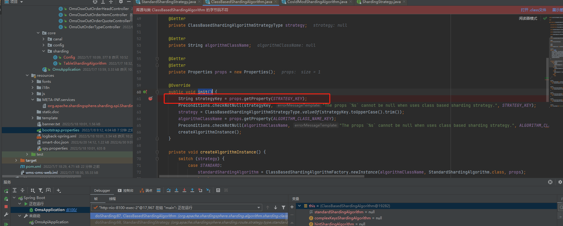 Thank you very much for your reply,When I try to use customization, I find that when I break the standardshardingstrategy #dosharding method, the attribute shardingalgorithm of standardshardingstrategy is indeed a classbasedshardingalgorithm object.  But when I go to the classbasedshardingalgorithm class next, I find that standardshardingalgorithm is empty. Then when I try to debug in classbasedshardingalgorithm#init(). It was found that after springboot was started, the init () method was not entered.   Later, when I try to upgrade shard JDBC to version 5.1.2, start the springboot environment. You will enter classbasedshardingalgorithm#init (),However, in versions 5.1.0 and 5.1.1, this init () method is not entered Thank you for your patience -- This is an automated message from the Apache Git Service. To respond to the message, please log on to GitHub and use the URL above to go to the specific comment. To unsubscribe, e-mail: [email protected] For queries about this service, please contact Infrastructure at: [email protected]