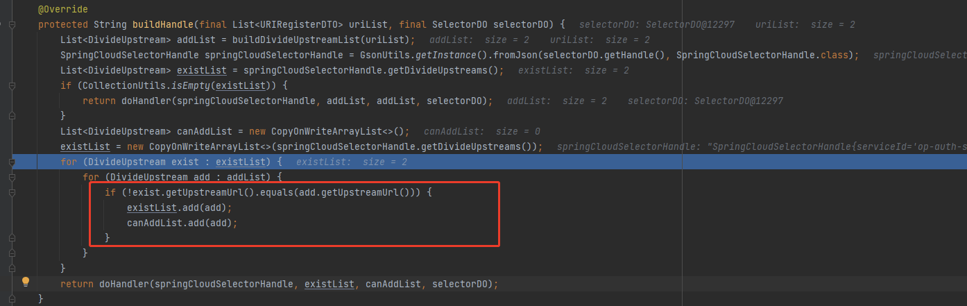 ### Is there an existing issue for this? - [X] I have searched the existing issues ### Current Behavior _No response_ ### Expected Behavior _No response_ ### Steps To Reproduce When you have two upstream:exist=[192.168.16.17:7001,192.168.16.18:7001] when you refresh it,addList=[192.168.16.17:7001,192.168.16.18:7001] !exist.equals(add)There will be a problem with judgment here  ### Environment ```markdown ShenYu version(s): 2.2.0.RELEASE ``` ### Debug logs _No response_ ### Anything else? _No response_ -- This is an automated message from the Apache Git Service. To respond to the message, please log on to GitHub and use the URL above to go to the specific comment. To unsubscribe, e-mail: [email protected] For queries about this service, please contact Infrastructure at: [email protected]