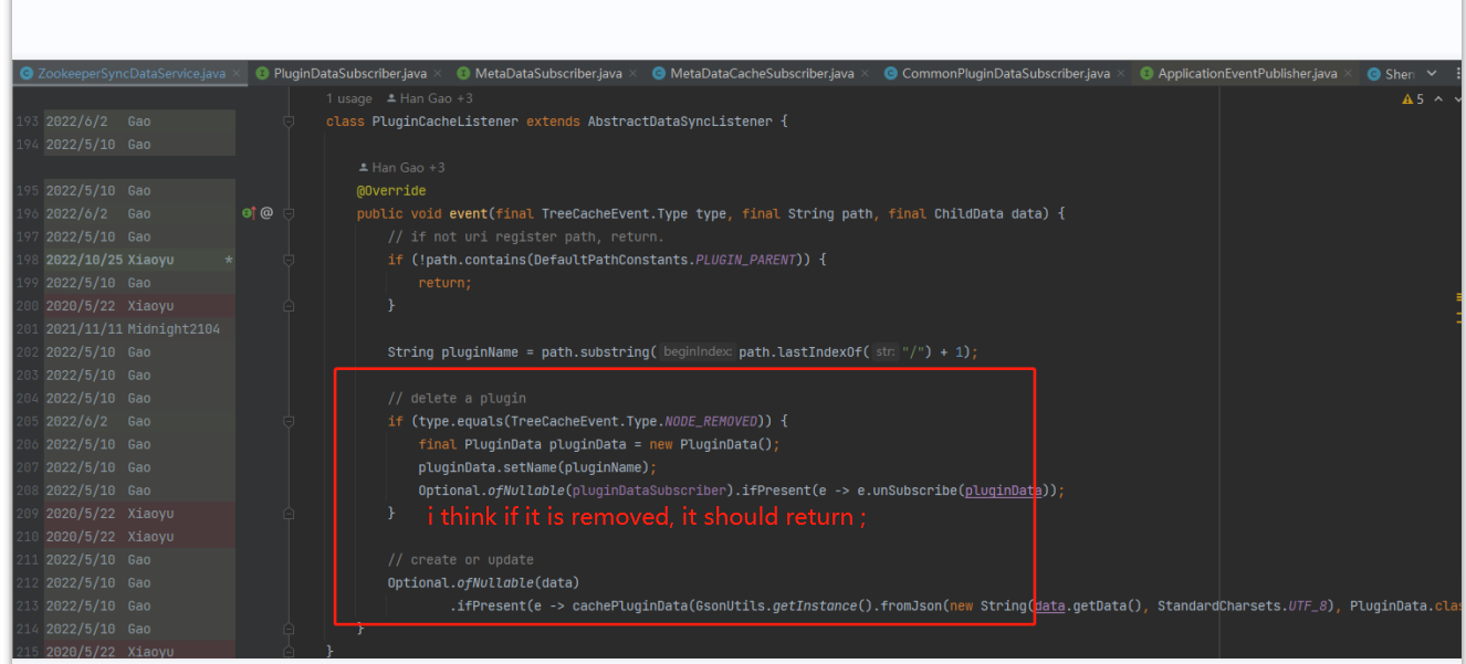 ### Is there an existing issue for this? - [X] I have searched the existing issues ### Current Behavior  i use shenyu2.5.1 with zookeeper sync way , when i delete selector,rule, shenyubootstrap gateway cache still exists ### Expected Behavior when i delete selector ,rule in the admin, the gateway cache be removed. ### Steps To Reproduce 1. apache shenyu 2.5.1 2. sync: zookeeper: url: ****:2181 sessionTimeout: 5000 connectionTimeout: 2000 3. i delete selector 4. i select the cache , http://localhost:9195/shenyu/plugin/selector/findList?pluginName=divide ### Environment ```markdown ShenYu version(s):2.5.1 ``` ### Debug logs ERROR org.apache.curator.framework.recipes.cache.TreeCache - java.lang.NullPointerException: null at org.apache.shenyu.plugin.base.trie.ShenyuTrieRuleListener.onApplicationEvent(ShenyuTrieRuleListener.java:42) at org.apache.shenyu.plugin.base.trie.ShenyuTrieRuleListener.onApplicationEvent(ShenyuTrieRuleListener.java:35) at org.springframework.context.event.SimpleApplicationEventMulticaster.doInvokeListener(SimpleApplicationEventMulticaster.java:176) at org.springframework.context.event.SimpleApplicationEventMulticaster.invokeListener(SimpleApplicationEventMulticaster.java:169) at org.springframework.context.event.SimpleApplicationEventMulticaster.multicastEvent(SimpleApplicationEventMulticaster.java:143) at org.springframework.context.support.AbstractApplicationContext.publishEvent(AbstractApplicationContext.java:421) at org.springframework.context.support.AbstractApplicationContext.publishEvent(AbstractApplicationContext.java:378) at org.apache.shenyu.plugin.base.cache.CommonPluginDataSubscriber.removeCacheData(CommonPluginDataSubscriber.java:252) at org.apache.shenyu.plugin.base.cache.CommonPluginDataSubscriber.lambda$subscribeDataHandler$4(CommonPluginDataSubscriber.java:170) at java.util.Optional.ifPresent(Optional.java:159) at org.apache.shenyu.plugin.base.cache.CommonPluginDataSubscriber.subscribeDataHandler(CommonPluginDataSubscriber.java:170) at org.apache.shenyu.plugin.base.cache.CommonPluginDataSubscriber.unRuleSubscribe(CommonPluginDataSubscriber.java:147) at org.apache.shenyu.sync.data.zookeeper.ZookeeperSyncDataService.lambda$unCacheRuleData$7(ZookeeperSyncDataService.java:137) at java.util.Optional.ifPresent(Optional.java:159) at org.apache.shenyu.sync.data.zookeeper.ZookeeperSyncDataService.unCacheRuleData(ZookeeperSyncDataService.java:137) at org.apache.shenyu.sync.data.zookeeper.ZookeeperSyncDataService.access$800(ZookeeperSyncDataService.java:50) at org.apache.shenyu.sync.data.zookeeper.ZookeeperSyncDataService$RuleCacheListener.event(ZookeeperSyncDataService.java:291) at org.apache.shenyu.sync.data.zookeeper.ZookeeperSyncDataService$AbstractDataSyncListener.childEvent(ZookeeperSyncDataService.java:180) at org.apache.curator.framework.recipes.cache.TreeCache$2.apply(TreeCache.java:760) at org.apache.curator.framework.recipes.cache.TreeCache$2.apply(TreeCache.java:754) at org.apache.curator.framework.listen.ListenerContainer$1.run(ListenerContainer.java:100) at org.apache.curator.shaded.com.google.common.util.concurrent.DirectExecutor.execute(DirectExecutor.java:30) at org.apache.curator.framework.listen.ListenerContainer.forEach(ListenerContainer.java:92) at org.apache.curator.framework.recipes.cache.TreeCache.callListeners(TreeCache.java:753) at org.apache.curator.framework.recipes.cache.TreeCache.access$1900(TreeCache.java:75) at org.apache.curator.framework.recipes.cache.TreeCache$4.run(TreeCache.java:865) at java.util.concurrent.Executors$RunnableAdapter.call(Executors.java:511) at java.util.concurrent.FutureTask.run$$$capture(FutureTask.java:266) at java.util.concurrent.FutureTask.run(FutureTask.java) at java.util.concurrent.ThreadPoolExecutor.runWorker(ThreadPoolExecutor.java:1149) at java.util.concurrent.ThreadPoolExecutor$Worker.run(ThreadPoolExecutor.java:624) at java.lang.Thread.run(Thread.java:748) ### Anything else? _No response_ -- This is an automated message from the Apache Git Service. To respond to the message, please log on to GitHub and use the URL above to go to the specific comment. To unsubscribe, e-mail: [email protected] For queries about this service, please contact Infrastructure at: [email protected]