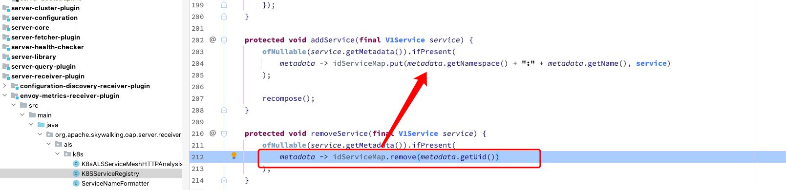 ### Fix <bug description or the bug issue number or bug issue link> - [ ] Add a unit test to verify that the fix works. - [X] Explain briefly why the bug exists and how to fix it. The function `removeService` used an incorrect key to remove the entry.  How to fix it: Use `namesapce:name` as the key. ```java protected void removeService(final V1Service service) { ofNullable(service.getMetadata()).ifPresent( metadata -> idServiceMap.remove(metadata.getNamespace() + ":" + metadata.getName()) ); } ``` - [ ] If this pull request closes/resolves/fixes an existing issue, replace the issue number. Closes #<issue number>. - [X] Update the [`CHANGES` log](https://github.com/apache/skywalking/blob/master/CHANGES.md). -- This is an automated message from the Apache Git Service. To respond to the message, please log on to GitHub and use the URL above to go to the specific comment. For queries about this service, please contact Infrastructure at: [email protected]