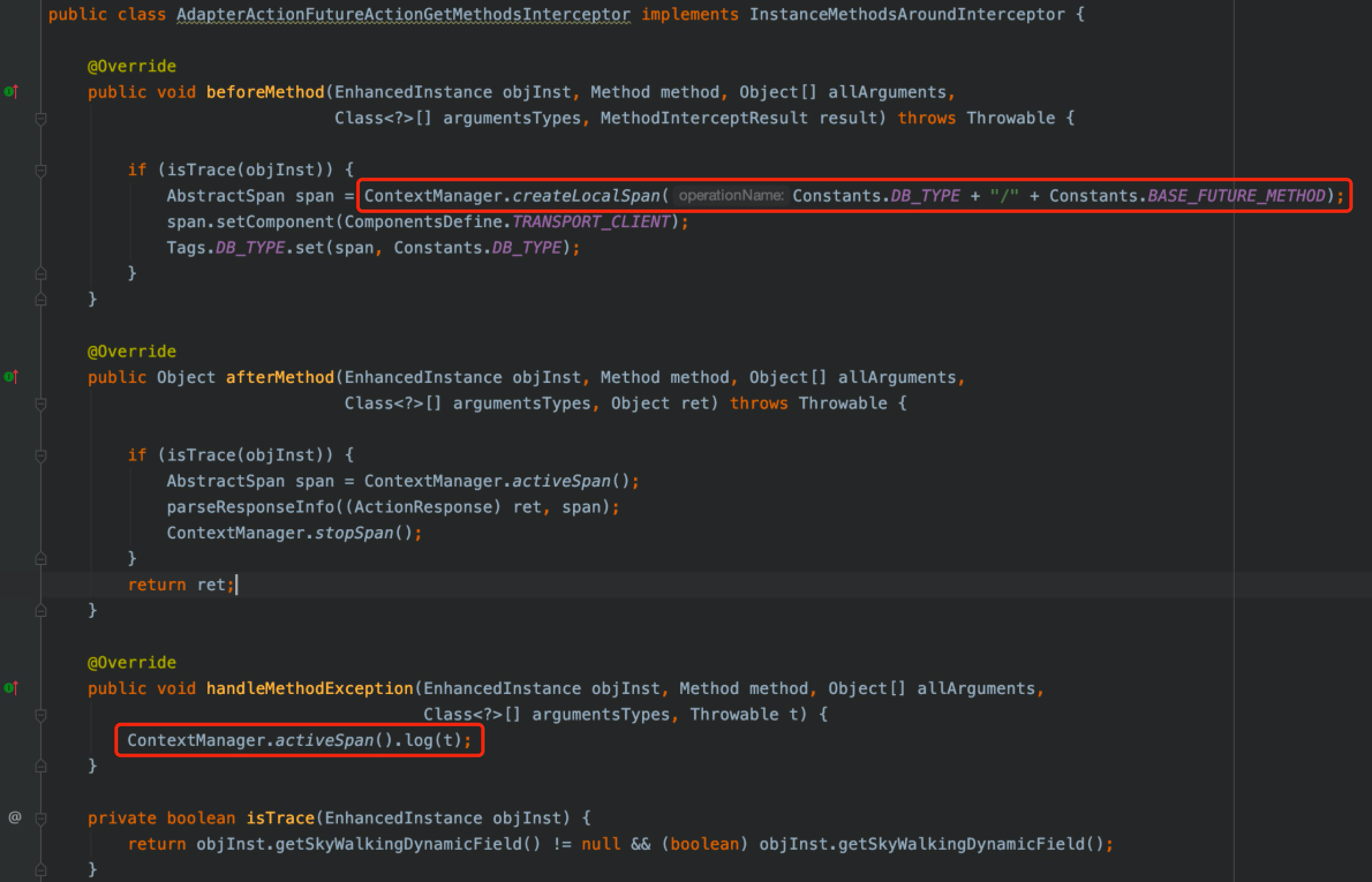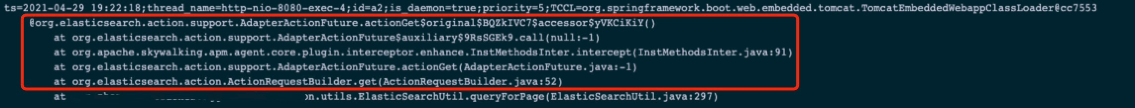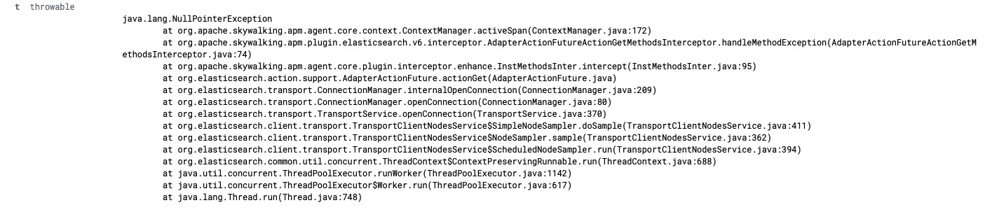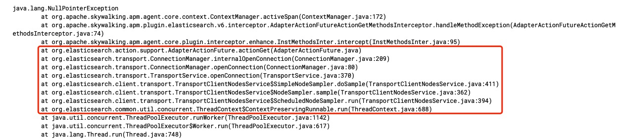 **Why NPE1 happens?**  First, we need to make it clear that skywalking sets dynamic fields when enhancing the `org.elasticsearch.client.transport.TransportClientNodesService.execute` method. Secondly, we need to know that the exception occurred in the `org.apache.skywalking.apm.plugin.elasticsearch.v6.interceptor.AdapterActionFutureActionGetMethodsInterceptor` class of enhanced the `org.elasticsearch.action.support.AdapterActionFuture.actionGet` method. Seeing this exception, I first suspect that the execution result of the `isTrace (objInst)` method in the `beforeMethod` method is false, which results in the `createLocalSpan` method not executing. And the `org.elasticsearch.action.support.AdapterActionFuture` class's instance method `actionGet` occurred exception in the normal execution process.  By using arthas to observe `org.elasticsearch.action.support.AdapterActionFuture.actionGet()` method, I get the following exception. ```java watch org.elasticsearch.action.support.AdapterActionFuture actionGet "{throwExp}" -e -x 2 -n 2 ts=2021-04-30 17:40:18; [cost=5.923075ms] result=@ArrayList[ ConnectTransportException[[][10.111.233.68:9300] general node connection failure]; nested: IllegalStateException[Received message from unsupported version: [6.3.2] minimal compatible version is: [6.8.0]]; at org.elasticsearch.transport.TcpTransport$ChannelsConnectedListener$1.onFailure(TcpTransport.java:957) at org.elasticsearch.transport.TransportHandshaker$HandshakeResponseHandler.handleResponse(TransportHandshaker.java:138) at org.elasticsearch.transport.TransportHandshaker$HandshakeResponseHandler.handleResponse(TransportHandshaker.java:115) at org.elasticsearch.transport.InboundHandler$1.doRun(InboundHandler.java:224) at org.elasticsearch.common.util.concurrent.AbstractRunnable.run(AbstractRunnable.java:37) at org.elasticsearch.common.util.concurrent.EsExecutors$DirectExecutorService.execute(EsExecutors.java:193) at org.elasticsearch.transport.InboundHandler.handleResponse(InboundHandler.java:216) at org.elasticsearch.transport.InboundHandler.messageReceived(InboundHandler.java:141) at org.elasticsearch.transport.InboundHandler.inboundMessage(InboundHandler.java:105) at org.elasticsearch.transport.TcpTransport.inboundMessage(TcpTransport.java:660) at org.elasticsearch.transport.netty4.Netty4MessageChannelHandler.channelRead(Netty4MessageChannelHandler.java:62) at io.netty.channel.AbstractChannelHandlerContext.invokeChannelRead(AbstractChannelHandlerContext.java:359) ... 32 more , ] ``` After asking related colleagues, I found that they called version 6.3.2 ES cluster by using version 7.2.1 ES SDK. Why the execution result of the `isTrace (objInst)` method in the `beforeMethod` method is false? I find that the skywalking dynamic fields are set when the `org.elasticsearch.client.transport.TransportClientNodesService.execute()` method is executed.  However, the `org.elasticsearch.client.transport.TransportClientNodesService.execute()` method is not executed every time before the `org.elasticsearch.action.support.AdapterActionFuture.actionGet()` method is executed. NPE occurs in the following execution path:  `ScheduledNodeSampler` periodically sniffs cluster nodes and does not execute the `org.elasticsearch.client.transport.TransportClientNodesService.execute()` method. NPE will not occur in the following execution path:  By looking at the `ActionRequestBuilder` method source code, you can know that the `org.elasticsearch.action.support.AdapterActionFuture.actionGet()` method is executed after the `org.elasticsearch.client.transport.TransportClientNodesService.execute()` method. So this exception has nothing to do with skywalking. It is caused by developers operating ES with an incompatible version of SDK. -- This is an automated message from the Apache Git Service. To respond to the message, please log on to GitHub and use the URL above to go to the specific comment. For queries about this service, please contact Infrastructure at: [email protected]