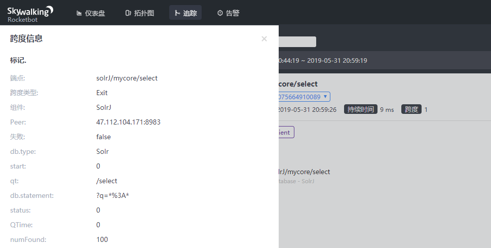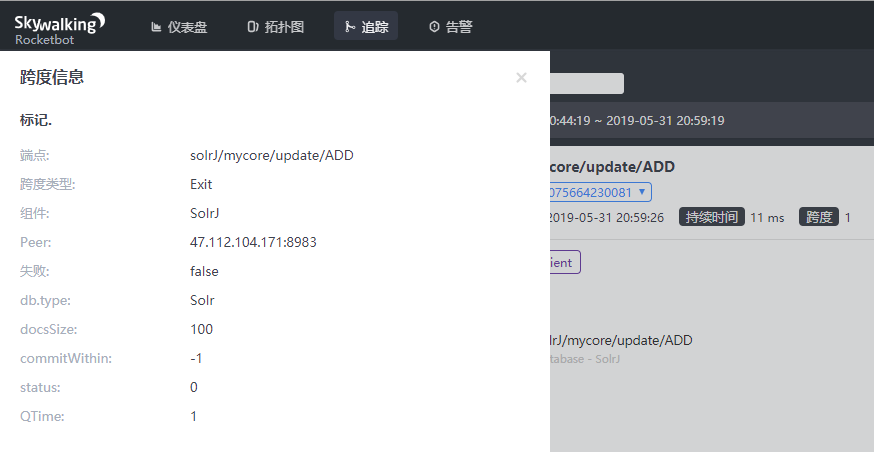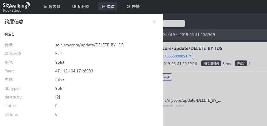dmsolr commented on issue #2730: Provide plugin for Solr-7.x(client) URL: https://github.com/apache/skywalking/pull/2730#issuecomment-497704069 Hi @wu-sheng , - common tags: 1. status : status of response. 2. qtime : solr - query tags 1. qt: Query Type - which Request Handler should handle the request. 2. numFound : the numer of SolrDocuments returned from a search. 3. db.statment: If it enable, span will trace the query parameters of query. (Default disable) - insert tags(/update/ADD) 1. docsSize: the number of committed documents. 2. commitWithin: the time horizon by which the document should be committed - delete tag(/update/DELETE_X) 1. delete.by : deletes a list of documents by doc_id. (or deletes documents base on query) - commit tags (/update/COMMIT) 1. softCommit : Performs an explicit commit, causing pending documents to be committed for indexing. - optimize tags (/update/OPTIMIZE) 1. maxOptimizeSegs : optimizes down to at most this number of segments On commit/optimize request,maybe need to trace waitFLush and waitSearch. They explain whether QTime is available. About `DB_INSTANCE`, for solr, to get this is expensive and useless.