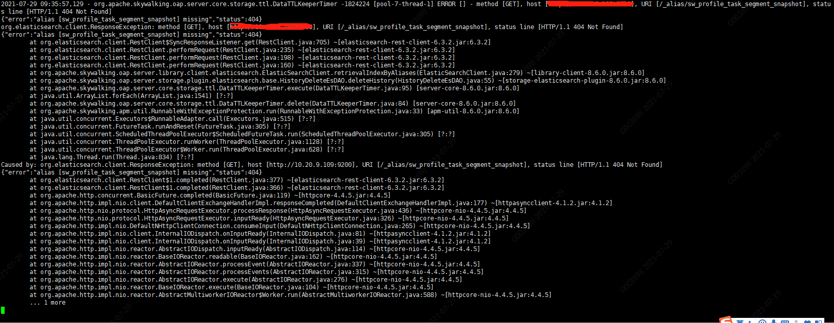 Please answer these questions before submitting your issue. - Why do you submit this issue? - [√] Question or discussion - [ ] Bug - [ ] Requirement - [ ] Feature or performance improvement ___ ### Question - useing skywalking 8.6.0, es6. - when i visit skywalking-ui topology, get error message "Exception while fetching data (/topo) : null", can't see any data. ___ - What happened? below is log:  backward, some other error about es index for timed task:  It seems that the ES initialization failed or some data was not generated, so i clear all es index and restart oap and ui, but always error,see es init index list: sw_metrics-longavg-20210729 sw_metrics-histogram-20210729 sw_metrics-sum-20210729 sw_meter-avg-20210729 sw_metrics-max-20210729 sw_metrics-doubleavg-20210729 sw_ui_template sw_metrics-percent-20210729 sw_metrics-percentile-20210729 sw_metrics-cpm-20210729 sw_metrics-rate-20210729 sw_metrics-apdex-20210729 Thank you very much. Looking forward to your reply! -- This is an automated message from the Apache Git Service. To respond to the message, please log on to GitHub and use the URL above to go to the specific comment. To unsubscribe, e-mail: [email protected] For queries about this service, please contact Infrastructure at: [email protected]