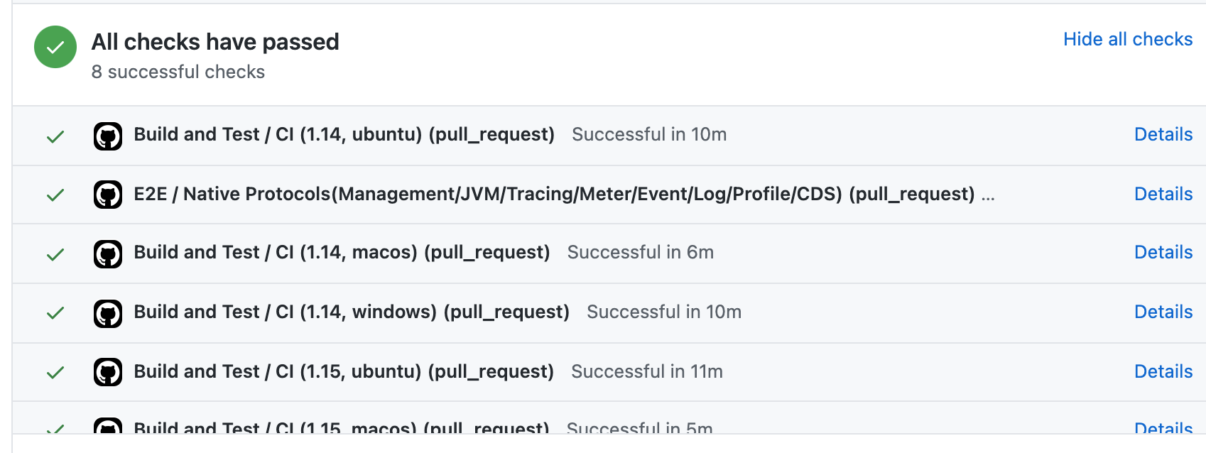 ########## File path: .github/workflows/e2e.yaml ########## @@ -0,0 +1,34 @@ +# Licensed to the Apache Software Foundation (ASF) under one +# or more contributor license agreements. See the NOTICE file +# distributed with this work for additional information +# regarding copyright ownership. The ASF licenses this file +# to you under the Apache License, Version 2.0 (the +# "License"); you may not use this file except in compliance +# with the License. You may obtain a copy of the License at +# +# http://www.apache.org/licenses/LICENSE-2.0 +# +# Unless required by applicable law or agreed to in writing, software +# distributed under the License is distributed on an "AS IS" BASIS, +# WITHOUT WARRANTIES OR CONDITIONS OF ANY KIND, either express or implied. +# See the License for the specific language governing permissions and +# limitations under the License. +name: E2E + +on: + pull_request: + push: + branches: + - main + +jobs: + JavaAgentE2E: + name: Native Protocols(Management/JVM/Tracing/Meter/Event/Log/Profile/CDS) Review comment:  It seems good in my screen(a 4K version). -- This is an automated message from the Apache Git Service. To respond to the message, please log on to GitHub and use the URL above to go to the specific comment. To unsubscribe, e-mail: [email protected] For queries about this service, please contact Infrastructure at: [email protected]