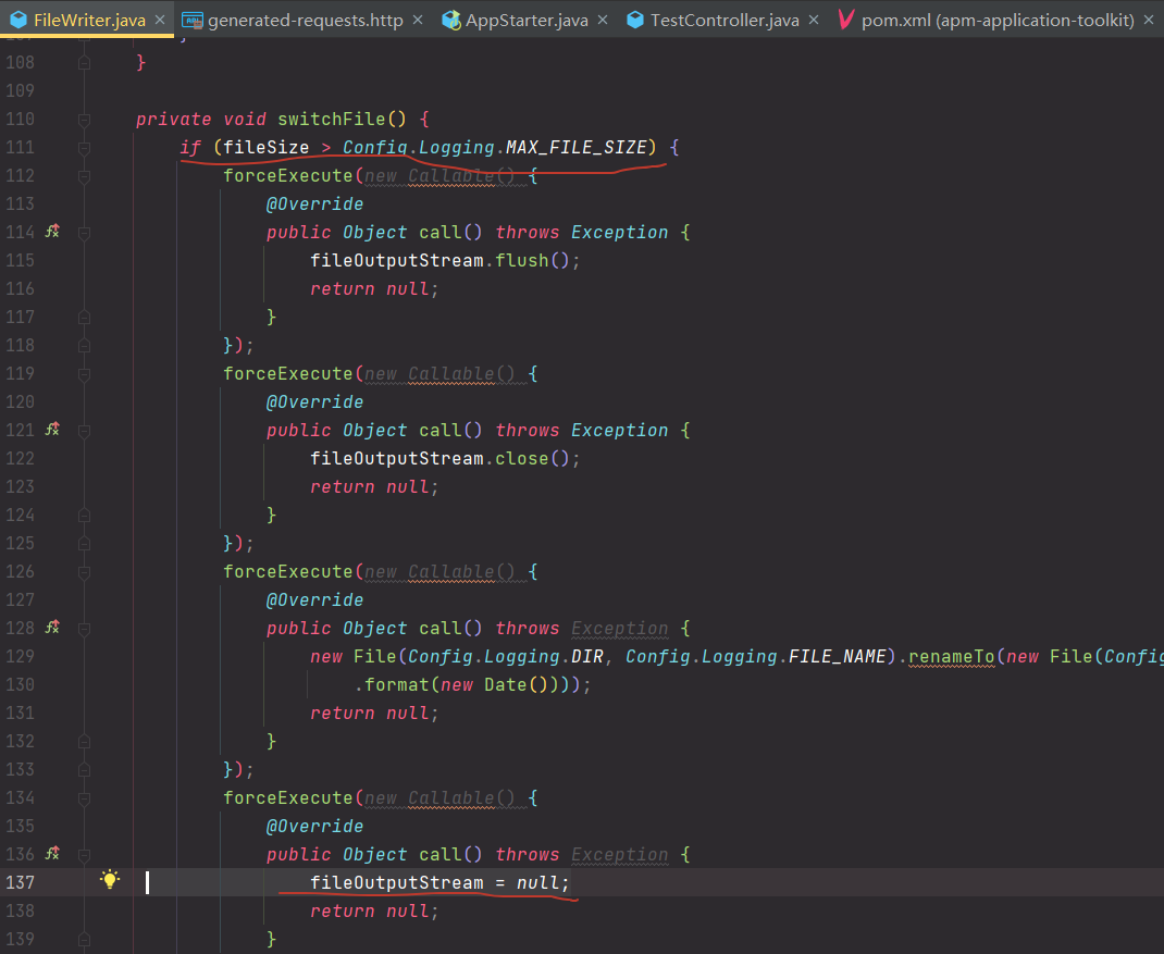 ### Search before asking - [X] I had searched in the [issues](https://github.com/apache/skywalking/issues?q=is%3Aissue) and found no similar issues. ### Apache SkyWalking Component Java Agent (apache/skywalking-java) ### What happened When Config.Logging.MAX_FILE_SIZE is smaller,fileOutputStream will be set to null. But LogFileWriter scheduled tasks are still executing ,fileOutputStream.flush() will produce NPE ,Although it was captured   ### What you expected to happen Expect not produce NPE ### How to reproduce Skywalking version: 8.9.1 Skywalking-Java-Agent version: 8.10.0 SpringBoot ### Anything else No response ### Are you willing to submit PR? - [X] Yes I am willing to submit a PR! ### Code of Conduct - [X] I agree to follow this project's [Code of Conduct](https://www.apache.org/foundation/policies/conduct) -- This is an automated message from the Apache Git Service. To respond to the message, please log on to GitHub and use the URL above to go to the specific comment. To unsubscribe, e-mail: [email protected] For queries about this service, please contact Infrastructure at: [email protected]