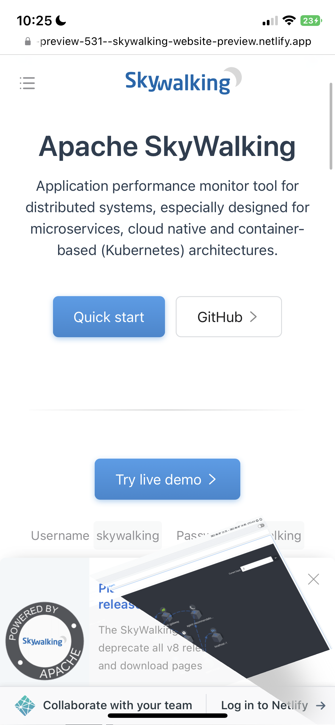 On my phone (ios safari/chrome) the screenshot tops the password part and the End-of-life popup.   -- This is an automated message from the Apache Git Service. To respond to the message, please log on to GitHub and use the URL above to go to the specific comment. To unsubscribe, e-mail: [email protected] For queries about this service, please contact Infrastructure at: [email protected]