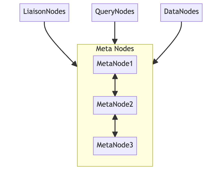 - Meta Nodes share high-level metadata about the cluster.