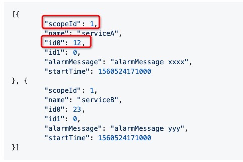 SevenBlue2018 opened a new issue #3672: Alarm Message URL: https://github.com/apache/skywalking/issues/3672  Why is the scopeId value of type int, not string? If the value is "Service", I think it will be easier to understand.