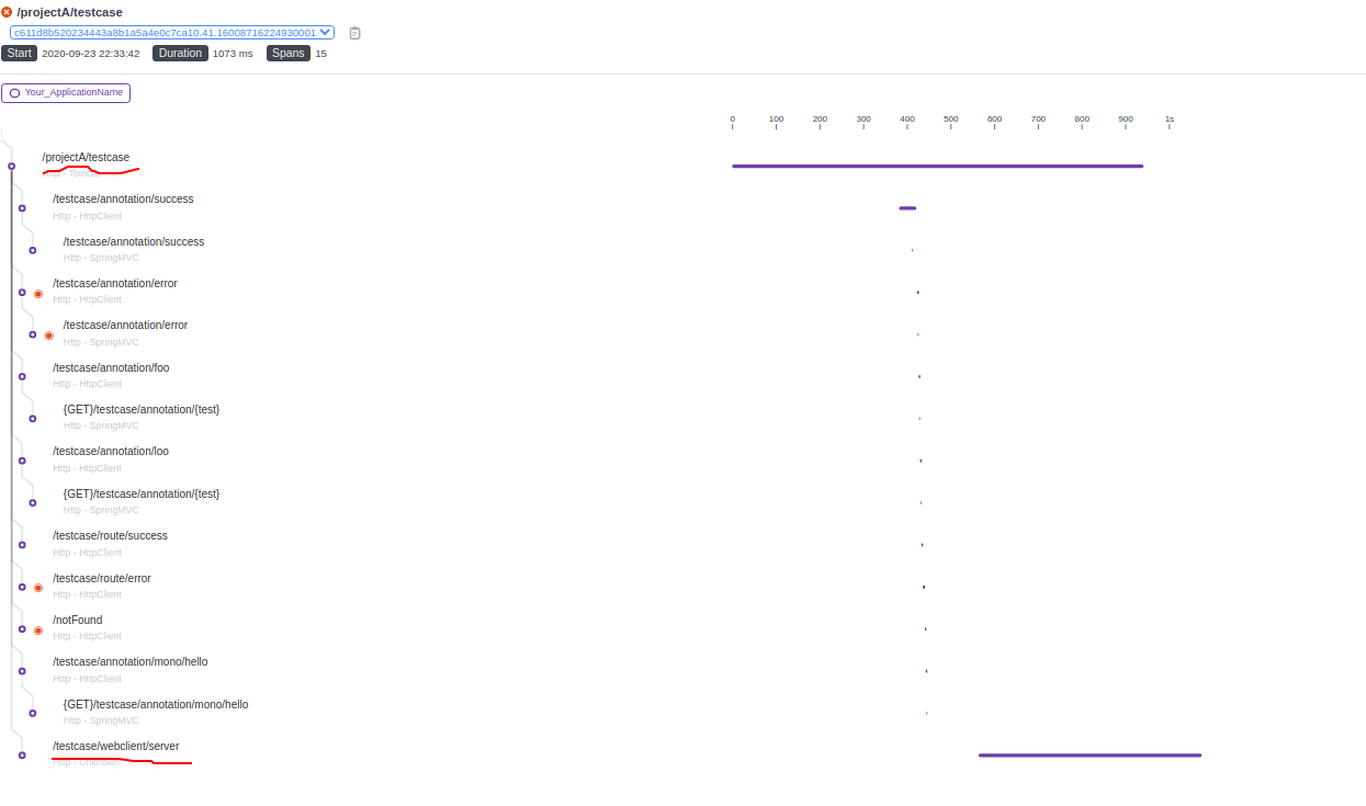 whether `/testcaset` finished too fast so that the data of entry span data was