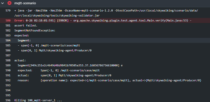 > @kezhenxu94 > I need some help, 'mqtt plugin' always fails in testing 'plugin test'. `expectedData.yaml`How to write it? I will take out the actual scope of the local test and configure it in the`expectedData.yaml`File. How can I pass' skywalking '- validator.jar `Verification, thank you! >  I've checked your `expectedData.yaml`, it's basically correct, but the `Mqtt/skywalking-agent/Consumer` span may not appear because the request finished before the consumer consumes the message, please refer to other similar test case ---------------------------------------------------------------- This is an automated message from the Apache Git Service. To respond to the message, please log on to GitHub and use the URL above to go to the specific comment. For queries about this service, please contact Infrastructure at: [email protected]