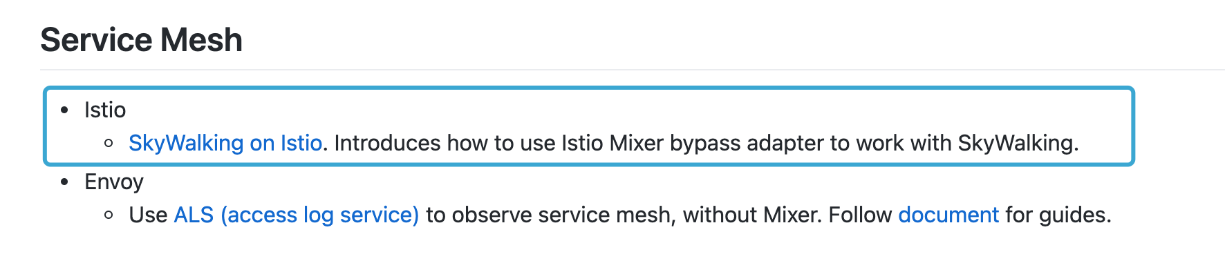 ########## File path: docs/en/setup/istio/README.md ########## @@ -1,28 +1,66 @@ # Work with Istio -Instructions for transport Istio's metrics to SkyWalking OAP server. +Instructions for transport Istio's metrics to the SkyWalking OAP server. ## Prerequisites -Istio should be installed in kubernetes cluster. Follow [Istio getting start](https://istio.io/docs/setup/getting-started/) +Istio should be installed in the kubernetes cluster. Follow [Istio getting start](https://istio.io/docs/setup/getting-started/) to finish it. ## Deploy Skywalking backend -Follow the [deploying backend in kubernetes](../backend/backend-k8s.md) to install oap server in kubernetes cluster. +Follow the [deploying backend in kubernetes](../backend/backend-k8s.md) to install the OAP server in the kubernetes cluster. +Referring to [OpenTelemetry receiver](../backend/backend-receivers.md#OpenTelemetry-receiver) to ingest metrics. -## Setup Istio to send metrics to oap -Our scripts are wrote based on Istio 1.3.3. +## Deploy OpenTelemetry collector +OpenTelemetry collector is the location Istio telemetry sends metrics, then processing and sending them to SkyWalking +backend. -1. Install Istio metric template +Following the [Getting Started](https://opentelemetry.io/docs/collector/getting-started/) to deploy this collector. There +are several components available in the collector, and they could be combined for different scenarios. + For the sake of brevity, we use the Prometheus receiver to retrieve metrics from Istio control and data plane, + then send them to SkyWalking by OpenCensus exporter. -`kubectl apply -f https://raw.githubusercontent.com/istio/istio/1.3.3/mixer/template/metric/template.yaml` +#### Prometheus receiver +Refer to [Prometheus Receiver](https://github.com/open-telemetry/opentelemetry-collector/blob/master/receiver/prometheusreceiver/README.md) + to set up this receiver. you could find more configuration details in [Prometheus Integration of Istio](https://istio.io/latest/docs/ops/integrations/prometheus/#configuration) + to figure out how to direct Prometheus receiver to query Istio metrics. + +SkyWalking supports receiving multi-cluster metrics in a single OAP cluster. A `cluster` label should be appended to every metric +fetched by this receiver even there's only a single cluster needed to be collected. +You could leverage `relabel` to add it like below: -2. Install SkyWalking adapter +``` +relabel_configs: +- source_labels: [] + target_label: cluster + replacement: <cluster name> +``` -`kubectl apply -f skywalkingadapter.yml` +or opt to [Resource Processor](https://github.com/open-telemetry/opentelemetry-collector/blob/master/processor/resourceprocessor/README.md): -Find the `skywalkingadapter.yml` at [here](yaml/skywalkingadapter.yml). +``` +processors: + resource: + attributes: + - key: cluster + value: "<cluster name>" + action: upsert +``` -NOTICE, due to Istio Mixer is default OFF, we recommend you to consider our [ALS solution](../envoy/als_setting.md) \ No newline at end of file +Notice, if you try the sample of istio Prometheus Kubernetes configuration, +the issues described [here](https://github.com/open-telemetry/opentelemetry-collector/issues/2163) might block you. +Try to use the solution indicated in this issue if it's not fixed. + +#### OpenCensus exporter +Follow [OpenCensus exporter configuration](https://github.com/open-telemetry/opentelemetry-collector/blob/master/exporter/opencensusexporter/README.md) +to set up a connection between OpenTelemetry collector and OAP cluster. `endpoint` is the address of OAP gRPC service. + +## Observe Istio + +Open Istio Dashboard in SkyWaling UI by clicking `Dashboard` -> `Istio`, then you're able to view charts and diagrams +generated by Istio metrics. You also could view them by `swctl` and set up alarm rules based on them. + + +NOTICE, if you want metrics of Istio managed service, including topology among them, we recommend you to consider our [ALS solution](../envoy/als_setting.md) Review comment: This doc has been changed, https://github.com/apache/skywalking/tree/68cc1ddea0eaa110ab4275cbf4f0f81040c3f8fe/docs/en/setup  ---------------------------------------------------------------- This is an automated message from the Apache Git Service. To respond to the message, please log on to GitHub and use the URL above to go to the specific comment. For queries about this service, please contact Infrastructure at: [email protected]