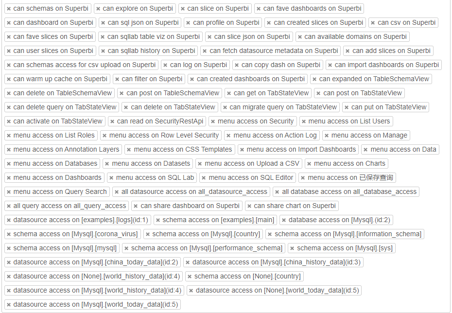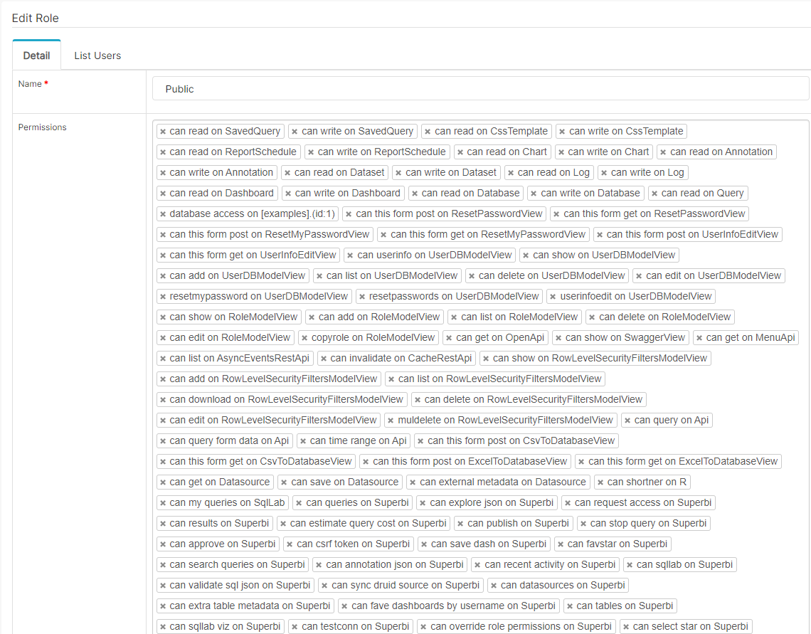 Hi, This is My Public role permissions,same as admin role permissions. But the error remains   ------------------ 原始邮件 ------------------ 发件人: "apache/superset" ***@***.***>; 发送时间: 2021年5月21日(星期五) 下午4:00 ***@***.***>; ***@***.******@***.***>; 主题: Re: [apache/superset] There was an issue fetching the favorite status of this dashboard. (#14720) The default for PUBLIC_ROLE_LIKE has no permissions https://github.com/apache/superset/blob/master/superset/config.py#L284 this means that non authenticated don't have access to any resource. Please share your Public role permissions, goto Security -> List Roles -> Edit (Public Role) — You are receiving this because you were mentioned. Reply to this email directly, view it on GitHub, or unsubscribe. -- This is an automated message from the Apache Git Service. To respond to the message, please log on to GitHub and use the URL above to go to the specific comment. For queries about this service, please contact Infrastructure at: [email protected] --------------------------------------------------------------------- To unsubscribe, e-mail: [email protected] For additional commands, e-mail: [email protected]