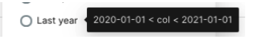 ## Screenshot  ## Description In time range filters the last year filter is actually mislabelled if you hover over it. It applies a year back from today (e.g. 2020-06-10 to 2021-06-11) but the hover over description says it applies the last calendar year (2020-01-01 to 2021-01-01). This is on version 1.0.1. -- This is an automated message from the Apache Git Service. To respond to the message, please log on to GitHub and use the URL above to go to the specific comment. For queries about this service, please contact Infrastructure at: [email protected] --------------------------------------------------------------------- To unsubscribe, e-mail: [email protected] For additional commands, e-mail: [email protected]
