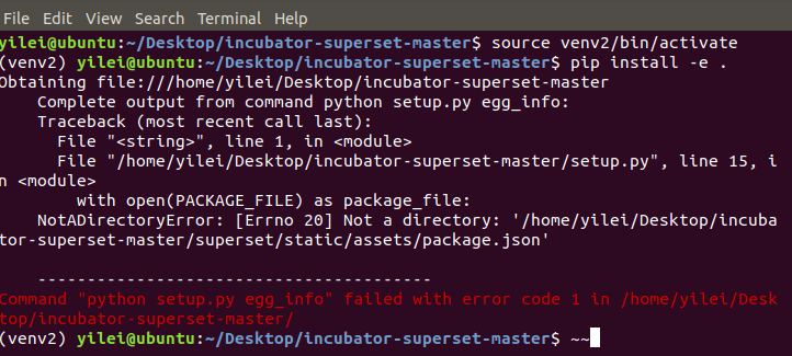 1106035348 opened a new issue #6538: pip install -e . faild URL: https://github.com/apache/incubator-superset/issues/6538  我已经运行过pip install -r requirements.txt和pip install -r requirements-dev.txt