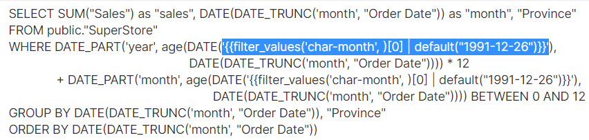 Hello! I'm new to Superset. I needed to create date selector and used Jinja to do it. Although the issue above was resolved, I stacked with same problem. A comma was added but warning didn't disappear. Enclosing screenshot from my virtual dataset.  -- This is an automated message from the Apache Git Service. To respond to the message, please log on to GitHub and use the URL above to go to the specific comment. To unsubscribe, e-mail: [email protected] For queries about this service, please contact Infrastructure at: [email protected] --------------------------------------------------------------------- To unsubscribe, e-mail: [email protected] For additional commands, e-mail: [email protected]