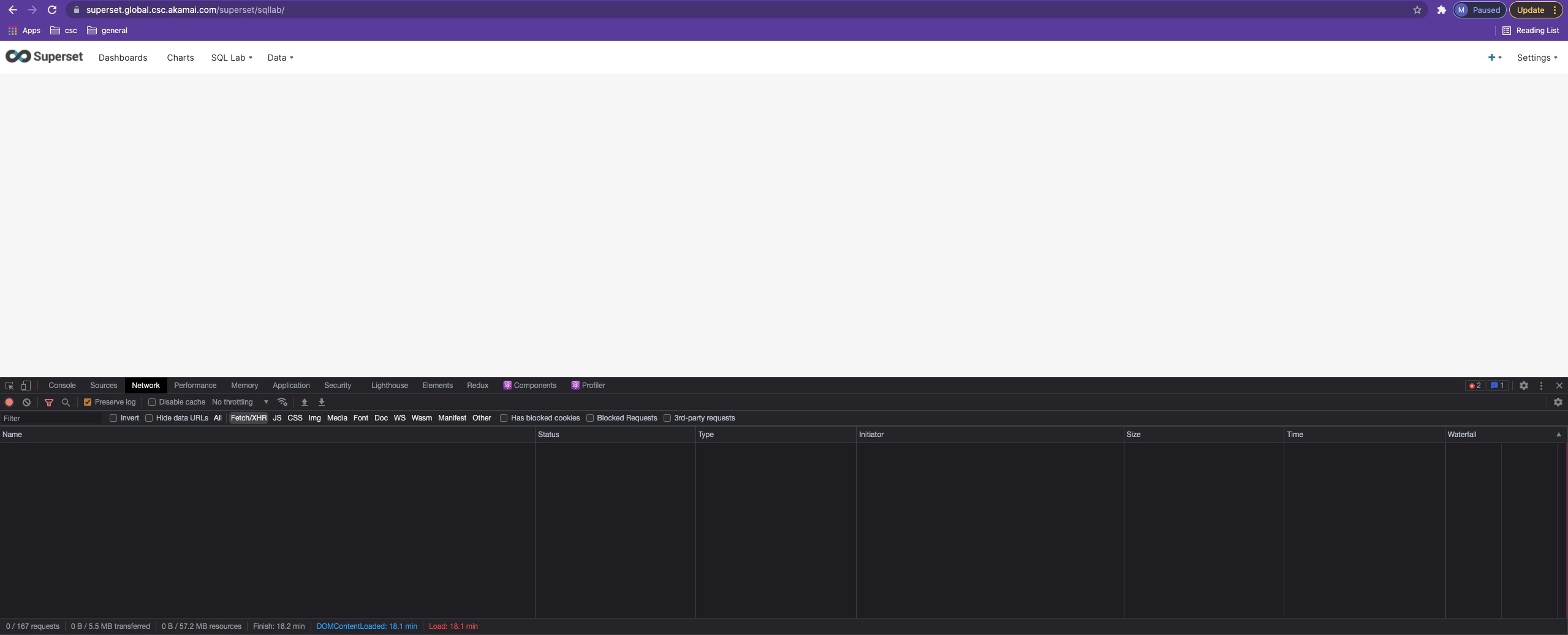 After fresh installation, chose not to load examples and added my own charts and a dashboard to test. Works fine till here. Then click on SQL Editor from under SQL Lab, the page does not load with no api calls as in the screenshot. I only see an error in console ( attached screenshot). #### Screenshots   ### Environment (please complete the following information): dev - browser type and version: Chrome Version 94.0.4606.61 (Official Build) (x86_64) - superset version: GIT sha 87baac7650bdb6a8f8f82cf4992567a2c5c73cba Superset 0.0.0dev - python version: 3.7.5 - node.js version: 14.18.0 -- This is an automated message from the Apache Git Service. To respond to the message, please log on to GitHub and use the URL above to go to the specific comment. To unsubscribe, e-mail: [email protected] For queries about this service, please contact Infrastructure at: [email protected] --------------------------------------------------------------------- To unsubscribe, e-mail: [email protected] For additional commands, e-mail: [email protected]