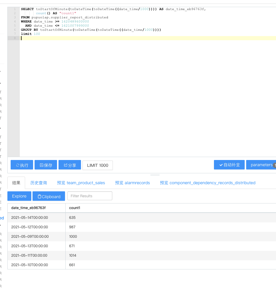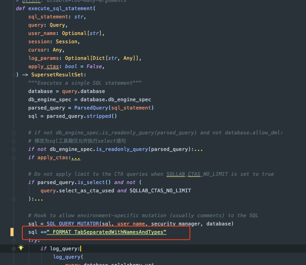 @liumengkai you can see this issue: https://github.com/xzkostyan/clickhouse-sqlalchemy/issues/14 btw: add FORMAT TabSeparatedWithNamesAndTypes  sqllab retuen data is correct  -- This is an automated message from the Apache Git Service. To respond to the message, please log on to GitHub and use the URL above to go to the specific comment. To unsubscribe, e-mail: [email protected] For queries about this service, please contact Infrastructure at: [email protected] --------------------------------------------------------------------- To unsubscribe, e-mail: [email protected] For additional commands, e-mail: [email protected]