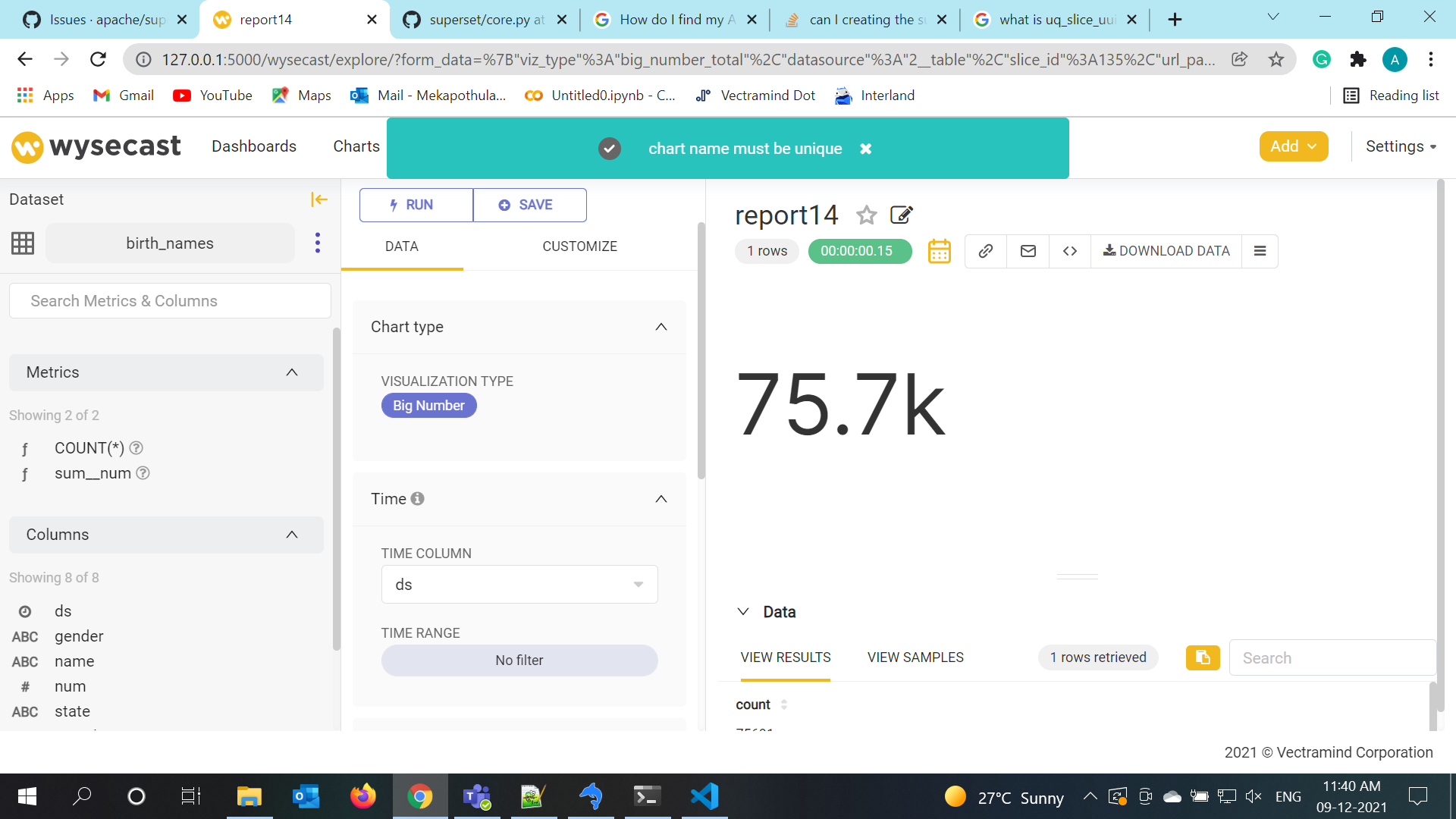 **Is your feature request related to a problem? Please describe.** A clear and concise description of what the problem is. Ex. I'm always frustrated when [...] **Describe the solution you'd like** A clear and concise description of what you want to happen. **Describe alternatives you've considered** A clear and concise description of any alternative solutions or features you've considered. **Additional context** Add any other context or screenshots about the feature request here.  <img width="956" alt="Screenshot 2021-12-09 114113" src="https://user-images.githubusercontent.com/82137779/145382509-c4560d4b-faa8-4541-bfc5-73048e0416e1.png"> I have been trying to create a new chart in superset the duplicates are not restricting. when I create it shows <img width="956" alt="Screenshot 2021-12-09 114113" src="https://user-images.githubusercontent.com/82137779/145382621-7e75d364-86af-41e7-bee4-97b861485f68.png"> the error message and after the page will be reloaded the duplicate name is created. -- This is an automated message from the Apache Git Service. To respond to the message, please log on to GitHub and use the URL above to go to the specific comment. To unsubscribe, e-mail: [email protected] For queries about this service, please contact Infrastructure at: [email protected] --------------------------------------------------------------------- To unsubscribe, e-mail: [email protected] For additional commands, e-mail: [email protected]