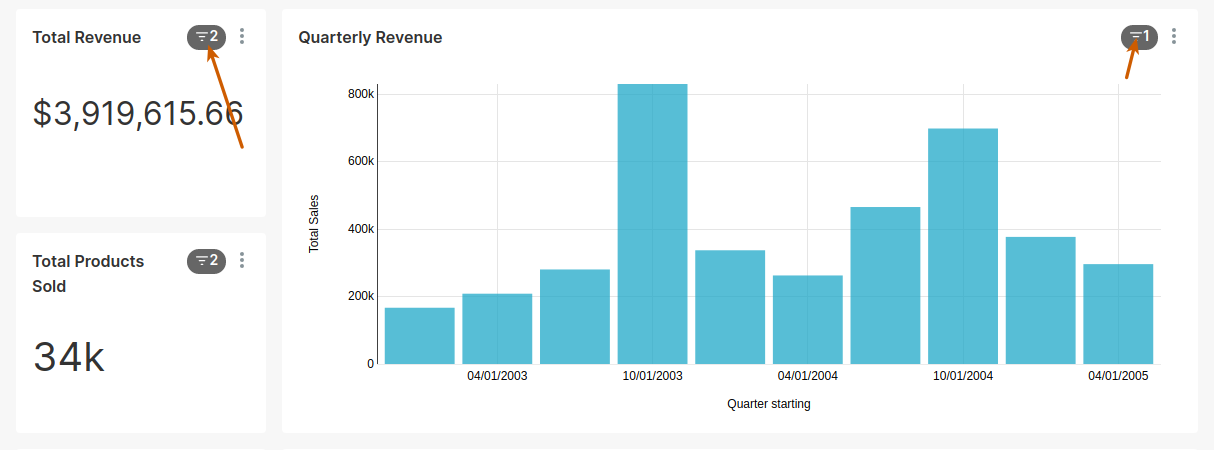 While same filters are applyed to all charts of the dashboard - different charts shown different count of filters #### How to reproduce the bug 1. Open `Sales dashboard` example 2. Go to `Exploratory` tab 3. Set `Time Range Filter` and `Product Line Filter` 4. Back to `Sales overview` 5. All charts shows same `2 filters applyed` 6. Go to `Exploratory` 7. Reset `Time Range Filter` to `No filter` 8. Back to `Sales overview` 9. Some of charts show expected `1 filter`, but some still show `2 filter` ### Expected results Same filter setting would cause same visible indicataion ### Actual results Filter apply indication is not based just on filters itself, but has some entropy due to chart type (?) #### Screenshots  -- This is an automated message from the Apache Git Service. To respond to the message, please log on to GitHub and use the URL above to go to the specific comment. To unsubscribe, e-mail: [email protected] For queries about this service, please contact Infrastructure at: [email protected] --------------------------------------------------------------------- To unsubscribe, e-mail: [email protected] For additional commands, e-mail: [email protected]