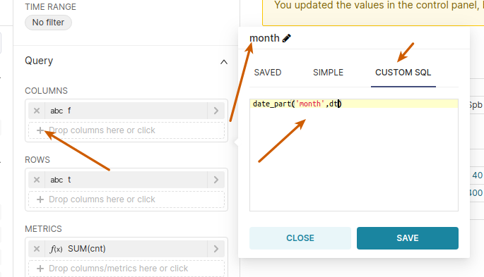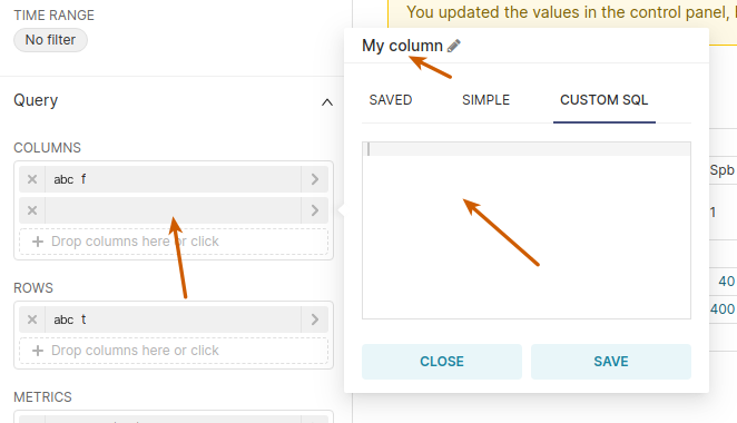 In `pivot table v2` setup, columns section (may be in all similar UI) - if you create CUSTOM SQL column, while it will be working - you will not see it's name in columns list, if you reopen it for edit - you will not see custom function - it will be lost. #### How to reproduce the bug 1. Create Pivot Table v2 for any dataset 2. In column list click `add column` 3. Choose `custom sql` 4. Assign name for query and write any legal sql function for column in text area 5. Save column 6. Empty column line will be in UI 7. Apply columns to table - all will be working fine 8. Reopen column for editing - all data - name and content will be lost! ### Expected results 1. After setup UI shows title for custom coolumn or it's function digest 2. Reopen for edit will keep custom function in editor box ### Actual results 1. Column information not shown 2. Reopen for edit opens empty editor without previous state #### Screenshots    -- This is an automated message from the Apache Git Service. To respond to the message, please log on to GitHub and use the URL above to go to the specific comment. To unsubscribe, e-mail: [email protected] For queries about this service, please contact Infrastructure at: [email protected] --------------------------------------------------------------------- To unsubscribe, e-mail: [email protected] For additional commands, e-mail: [email protected]