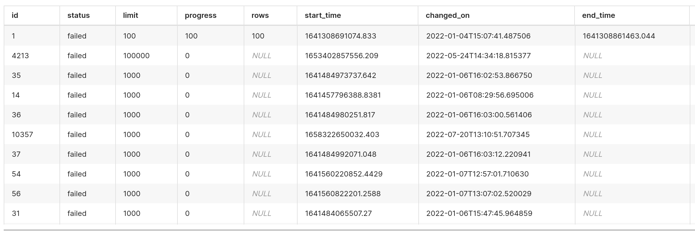Often (not always) `end_time` isn't being set/written to the Superset database in case a query fails.  As can be seen here for all failed queries except the first one the `end_date` isn't set. We use the query status as well as the runtimes (which we have to derive from by subtracting `start_time` from `end_time`) from the Superset database to monitor how well our Superset + SQL environment is doing. The lack of an `end_time` for failed queries means our reporting is incomplete and thus skewed because the runtimes of problematic/failing queries can't be included. #### How to reproduce the bug - Run a query that fails - Check in the Superset database and see that it doesn't have `end_date` set Note that I'm not sure why for some queries we do see an `end_time`. ### Expected results `end_time` is always filled in, irrespective of if the query succeeded or not ### Actual results `end_time` is pretty much never filled in when a query fails ### Environment - Superset version: 2.0.0 (we're using the `apache/superset:2.0.0` Docker image) - In case it matters we're using Spark Thriftserver as our SQL engine ``` FEATURE_FLAGS = { "SQLLAB_BACKEND_PERSISTENCE": True, "ENABLE_TEMPLATE_PROCESSING": True, "ENABLE_TEMPLATE_REMOVE_FILTERS": True, } ``` -- This is an automated message from the Apache Git Service. To respond to the message, please log on to GitHub and use the URL above to go to the specific comment. To unsubscribe, e-mail: [email protected] For queries about this service, please contact Infrastructure at: [email protected] --------------------------------------------------------------------- To unsubscribe, e-mail: [email protected] For additional commands, e-mail: [email protected]