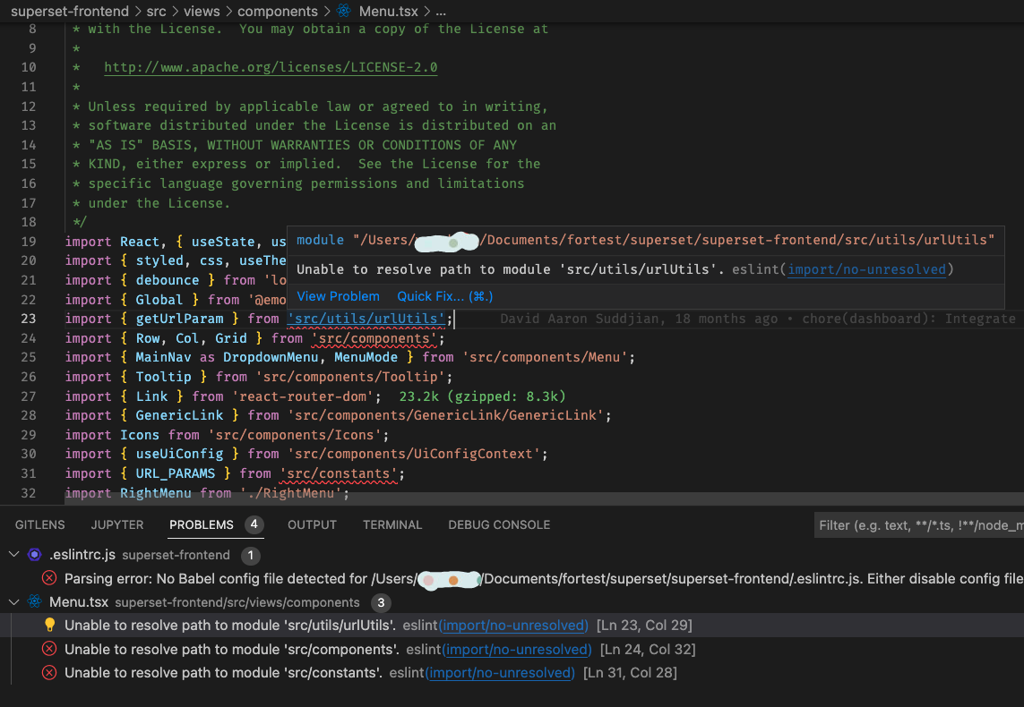 Fix eslint error message in VSCode 1. Import error: Unable to resolve path to module 'src/utils/urlUtils' 2. Parsing error: No Babel config file detected for /superset/superset-frontend/.eslintrc.js. Either disable config file checking with requireConfigFile:false, or configure Babel so that it can find the config files.  ### SUMMARY <!--- Describe the change below, including rationale and design decisions --> ### BEFORE/AFTER SCREENSHOTS OR ANIMATED GIF <!--- Skip this if not applicable --> ### TESTING INSTRUCTIONS <!--- Required! What steps can be taken to manually verify the changes? --> ### ADDITIONAL INFORMATION <!--- Check any relevant boxes with "x" --> <!--- HINT: Include "Fixes #nnn" if you are fixing an existing issue --> - [ ] Has associated issue: - [ ] Required feature flags: - [ ] Changes UI - [ ] Includes DB Migration (follow approval process in [SIP-59](https://github.com/apache/superset/issues/13351)) - [ ] Migration is atomic, supports rollback & is backwards-compatible - [ ] Confirm DB migration upgrade and downgrade tested - [ ] Runtime estimates and downtime expectations provided - [ ] Introduces new feature or API - [ ] Removes existing feature or API -- This is an automated message from the Apache Git Service. To respond to the message, please log on to GitHub and use the URL above to go to the specific comment. To unsubscribe, e-mail: [email protected] For queries about this service, please contact Infrastructure at: [email protected] --------------------------------------------------------------------- To unsubscribe, e-mail: [email protected] For additional commands, e-mail: [email protected]