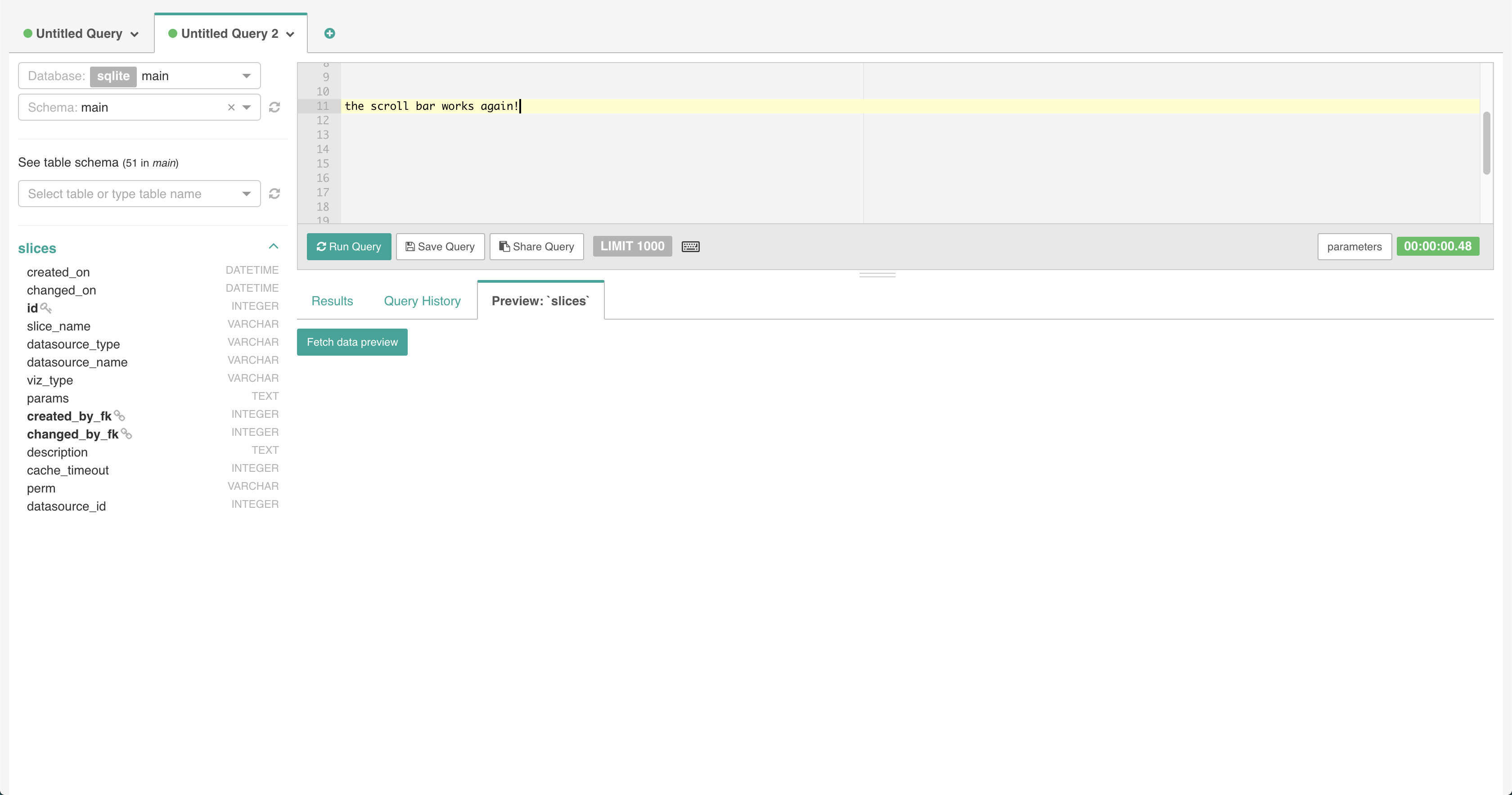 etr2460 opened a new pull request #8146: Revert "Allow resizing width of SQL Lab left bar / editor" URL: https://github.com/apache/incubator-superset/pull/8146 Reverts apache/incubator-superset#8099 This PR broke the SQL Lab query editor when the query is longer than can fit in the box. Scrolling no longer works. Before revert:  After revert:  CSS is hard :(