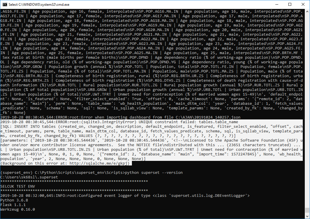 arslanselcuk commented on issue #6197: Not able to import dashboard in the latest version of superset URL: https://github.com/apache/incubator-superset/issues/6197#issuecomment-546827965 Same issue here: Superset version 0.30.0 Running on Windows10 I wanted to investigate import_dashboards feature to execute DTAP pipeline. - I saved as one of the existing dashboards. (named it "testSelcuk" ) - Then exported this new dashboard as JSON file. - Then deleted this dashboard. - then typed python import_dashboards -f "path of testSelcuk" I reveive the error : 2019-10-28 08:30:45,544:ERROR:root:(sqlite3.IntegrityError) UNIQUE constraint failed: tables.table_name [SQL: INSERT INTO tables (created_on, changed_on, description, default_endpoint, is_featured, filter_select_enabled, "offset", cache_timeout, params, perm, table_name, main_dttm_col, database_id, fetch_values_predicate, schema, sql, is_sqllab_view, template_params, created_by_fk, changed_by_fk) VALUES (?, ?, ?, ?, ?, ?, ?, ?, ?, ?, ?, ?, ?, ?, ?, ?, ?, ?, ?, ?)] [parameters: ('2019-10-28 08:30:45.544436', '2019-10-28 08:30:45.544436', '<!--\nLicensed to the Apache Software Foundation (ASF) under one\nor more contributor license agreements. See the NOTICE file\ndistributed with this ... (23651 characters truncated) ... L | Urban population\nSP.URB.TOTL.IN.ZS | Urban population (% of total)\nSP.UWT.TFRT | Unmet need for contraception (% of married women ages 15-49)\n', None, 0, 1, 0, None, '{"remote_id": 2, "database_name": "main", "import_time": 1572247845}', None, 'wb_health_population', 'year', 2, None, None, None, 0, None, None, None)] (Background on this error at: http://sqlalche.me/e/gkpj  )