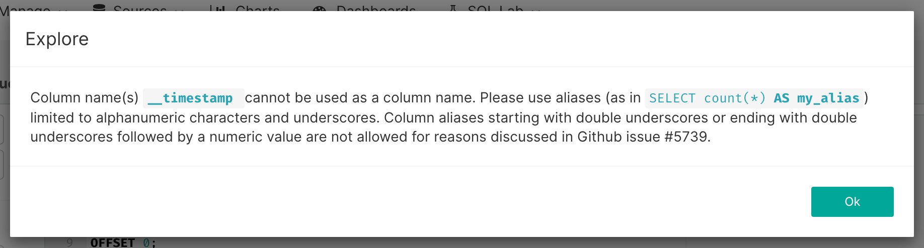 ### SUMMARY Currently Sql Lab accepts the column name `__timestamp`, which causes problems when pressing the "Explore" button. This adds a check for column names starting with double underscores. ### BEFORE   ### AFTER  ### TEST PLAN Local testing + new tests ### ADDITIONAL INFORMATION <!--- Check any relevant boxes with "x" --> <!--- HINT: Include "Fixes #nnn" if you are fixing an existing issue --> - [ ] Has associated issue: - [ ] Changes UI - [ ] Requires DB Migration. - [ ] Confirm DB Migration upgrade and downgrade tested. - [ ] Introduces new feature or API - [ ] Removes existing feature or API ---------------------------------------------------------------- This is an automated message from the Apache Git Service. To respond to the message, please log on to GitHub and use the URL above to go to the specific comment. For queries about this service, please contact Infrastructure at: [email protected] --------------------------------------------------------------------- To unsubscribe, e-mail: [email protected] For additional commands, e-mail: [email protected]