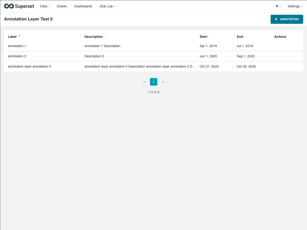 ### SUMMARY <!--- Describe the change below, including rationale and design decisions --> - Annotation List CRUD view ### BEFORE/AFTER SCREENSHOTS OR ANIMATED GIF <!--- Skip this if not applicable -->  ### TEST PLAN <!--- What steps should be taken to verify the changes --> WIP ### ADDITIONAL INFORMATION <!--- Check any relevant boxes with "x" --> <!--- HINT: Include "Fixes #nnn" if you are fixing an existing issue --> - [ ] Has associated issue: - [x] Changes UI - [ ] Requires DB Migration. - [ ] Confirm DB Migration upgrade and downgrade tested. - [ ] Introduces new feature or API - [ ] Removes existing feature or API ---------------------------------------------------------------- This is an automated message from the Apache Git Service. To respond to the message, please log on to GitHub and use the URL above to go to the specific comment. For queries about this service, please contact Infrastructure at: [email protected] --------------------------------------------------------------------- To unsubscribe, e-mail: [email protected] For additional commands, e-mail: [email protected]