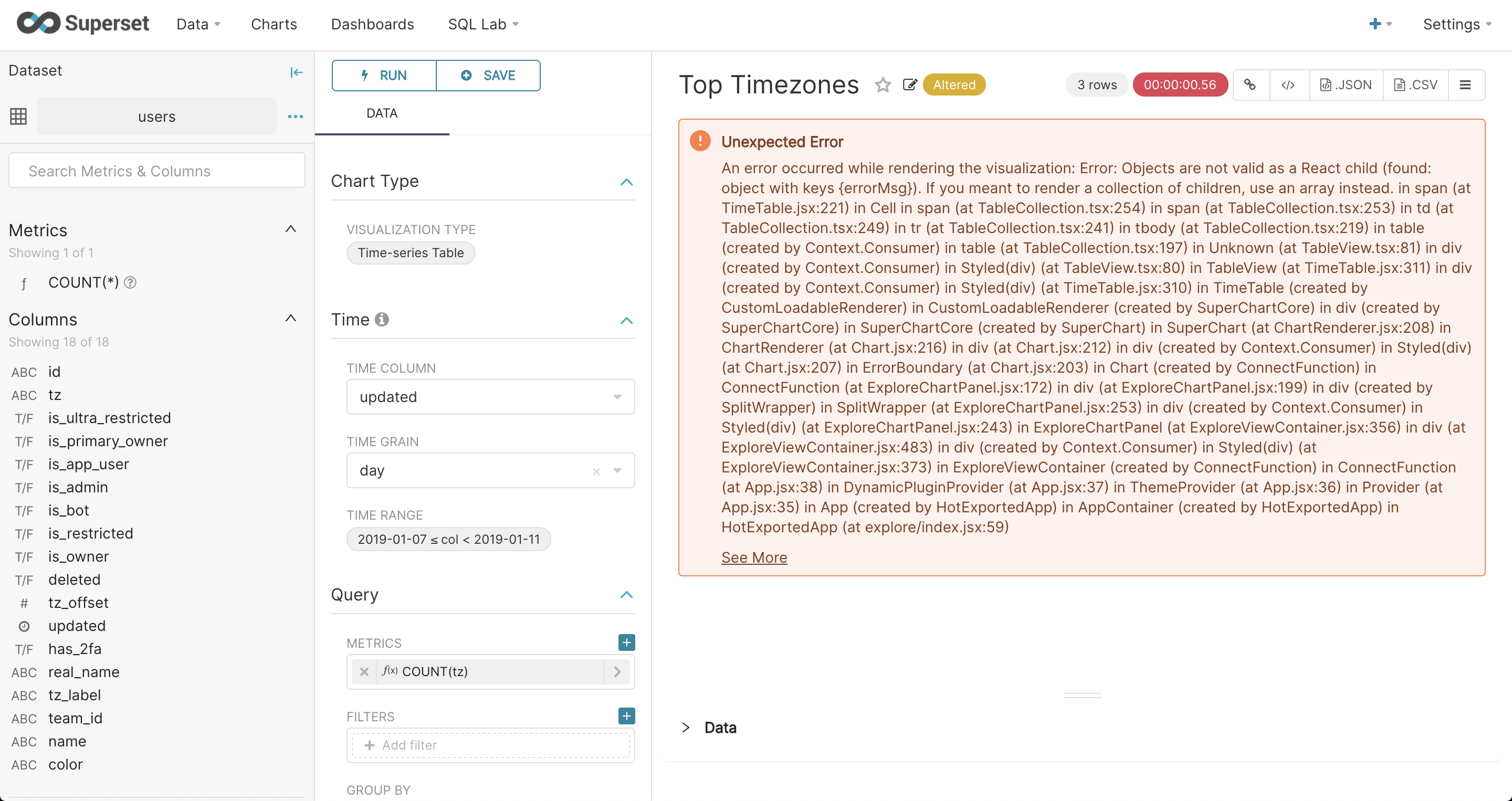### SUMMARY Fixes https://github.com/apache/superset/issues/12646 ### BEFORE/AFTER SCREENSHOTS OR ANIMATED GIF Before:  After:  ### TEST PLAN Create a time-series table with time lag larger than the number of rows in the table - before the fix it generated a react error, now it displays a proper error message ### ADDITIONAL INFORMATION <!--- Check any relevant boxes with "x" --> <!--- HINT: Include "Fixes #nnn" if you are fixing an existing issue --> - [x] Has associated issue: https://github.com/apache/superset/issues/12646 - [ ] Changes UI - [ ] Requires DB Migration. - [ ] Confirm DB Migration upgrade and downgrade tested. - [ ] Introduces new feature or API - [ ] Removes existing feature or API CC: @junlincc @john-bodley @villebro @adam-stasiak ---------------------------------------------------------------- This is an automated message from the Apache Git Service. To respond to the message, please log on to GitHub and use the URL above to go to the specific comment. For queries about this service, please contact Infrastructure at: [email protected] --------------------------------------------------------------------- To unsubscribe, e-mail: [email protected] For additional commands, e-mail: [email protected]