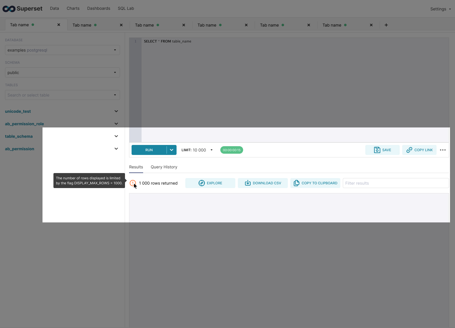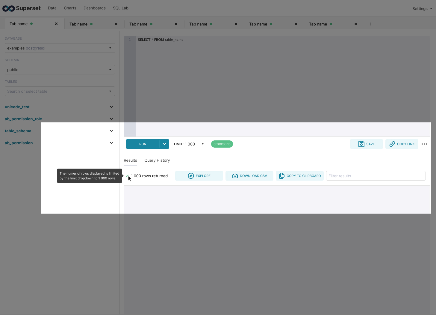 wanted to share this mockup here that shows a row returned indicator with additional info upon hover. I positioned the indicator under the results tab since it has a direct relationship with the result table. The indicator displays w a success check icon when the row returned matches the limit dropdown or the limit specified in the query w a tooltip that adds context. The indicator displays with a warning icon when the row returned _does not_ match the limit dropdown w a tooltip that describes why. ie "The number of rows displayed is limited by the flag DISPLAY_MAX_ROWS = 1000".   cc @yousoph @tooptoop4 @himanshpal @ramyarajasekaran ---------------------------------------------------------------- This is an automated message from the Apache Git Service. To respond to the message, please log on to GitHub and use the URL above to go to the specific comment. For queries about this service, please contact Infrastructure at: [email protected] --------------------------------------------------------------------- To unsubscribe, e-mail: [email protected] For additional commands, e-mail: [email protected]