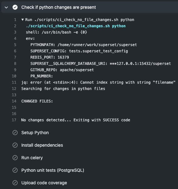### SUMMARY When working on a branch before opening a PR I noticed that the conditional test skipping doesn't work properly when `PR_NUMBER` isn't available (=not a PR). This changes tests to always execute when it isn't a PR, for example after merging or when just working on a branch. ### BEFORE  ### AFTER  ### TEST PLAN <!--- What steps should be taken to verify the changes --> ### ADDITIONAL INFORMATION <!--- Check any relevant boxes with "x" --> <!--- HINT: Include "Fixes #nnn" if you are fixing an existing issue --> - [ ] Has associated issue: - [ ] Changes UI - [ ] Requires DB Migration. - [ ] Confirm DB Migration upgrade and downgrade tested. - [ ] Introduces new feature or API - [ ] Removes existing feature or API ---------------------------------------------------------------- This is an automated message from the Apache Git Service. To respond to the message, please log on to GitHub and use the URL above to go to the specific comment. For queries about this service, please contact Infrastructure at: [email protected] --------------------------------------------------------------------- To unsubscribe, e-mail: [email protected] For additional commands, e-mail: [email protected]