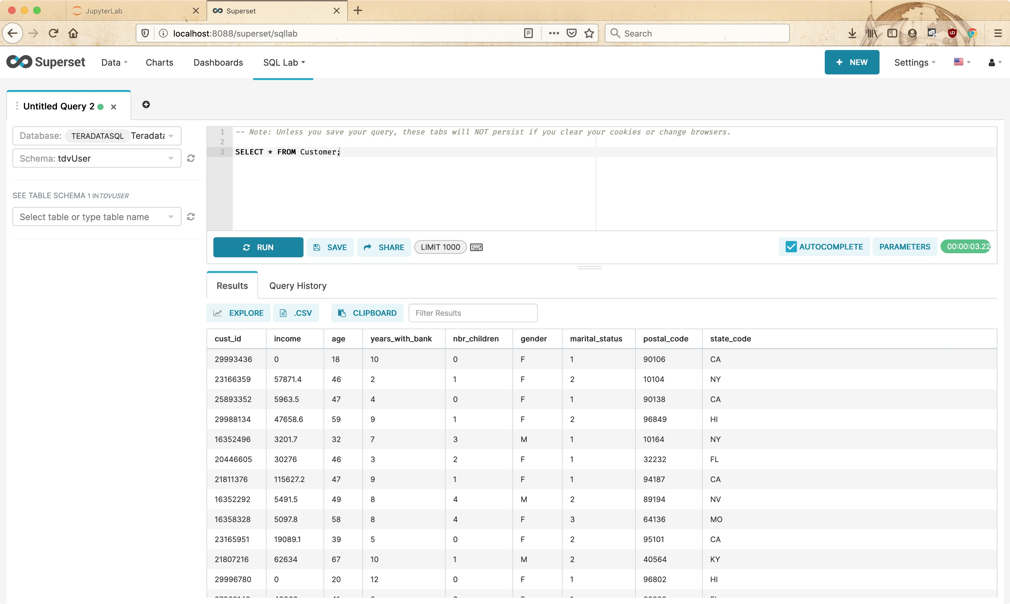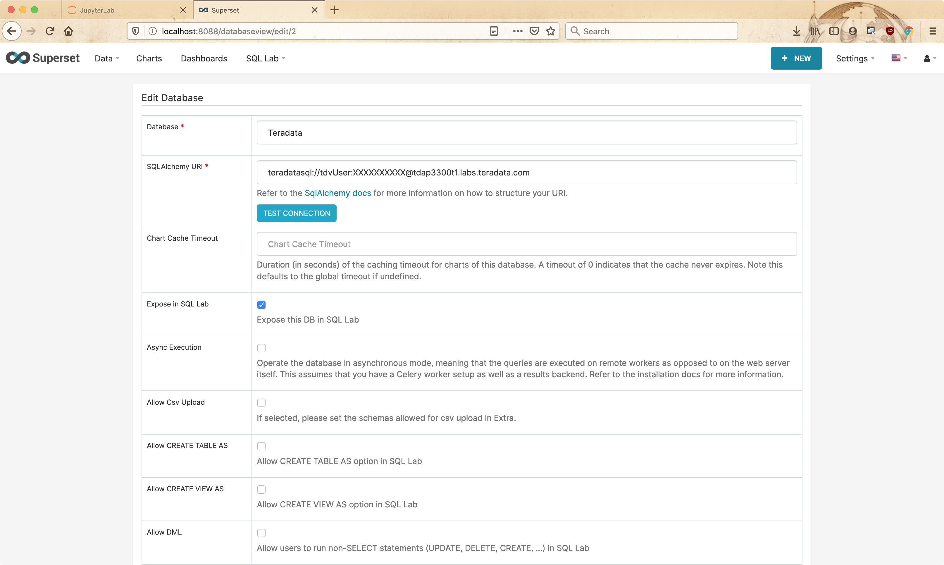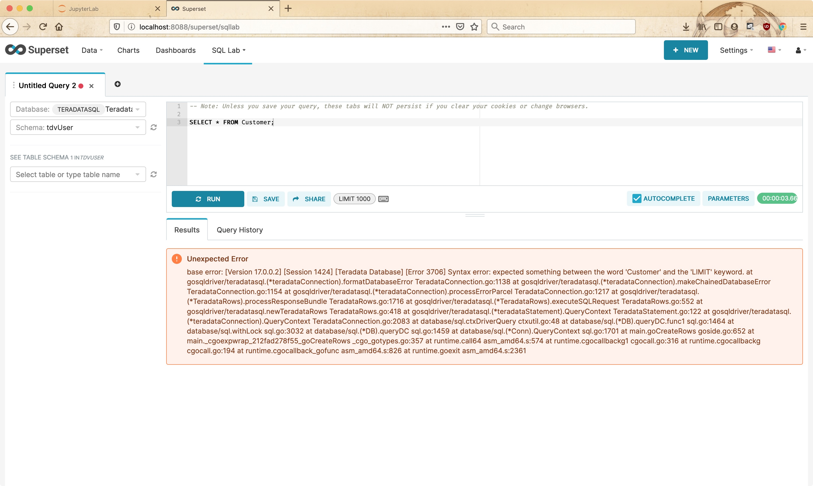 ### SUMMARY In attempting to use Apache Superset with Teradata, we observed the following: [Topic 1] The connection instructions provided at https://superset.apache.org/docs/databases/teradata can be updated to the latest and most efficient way to connect to an Advanced SQL Engine (formerly Teradata Database) of a Teradata Vantage system. [Topic 2] Most critically, with the current Superset codebase (as of apache-superset v.1.0.1) an error occurs when attempting to perform a simple SELECT query in the SQL Lab; see Figure 1 below. Namely, observe in Figure 1 the "Syntax Error: expected something between the word '<table_Name>' and the 'LIMIT' keyword". The root cause for this error is the improper translation to Teradata SQL of the 'LIMIT' keyword in the Superset back-end. Teradata SQL uses the 'TOP' or 'SAMPLE' keywords instead of 'LIMIT'. Observe that issue #11405 appears to be closely related to this issue. ### BEFORE/AFTER SCREENSHOTS OR ANIMATED GIF    ### TEST PLAN This solution works and is tested with Teradata Vantage, but we are happy to make other modifications if the team supports. ### ADDITIONAL INFORMATION The request all realtes to the follwoing bug New or Changed Public Interfaces The present proposal requires no new or changed public interfaces. New dependencies Only for Teradata connections, the present proposal requires the installation of the teradatasqlalchemy connector, and the teradatasql driver packages to connect to a Teradata Vantage system Advanced SQL Engine Database. These packages are actively maintained and their licenses are Teradata proprietary. The teradatasql license can be found at: https://github.com/Teradata/python-driver/blob/master/LICENSE whereas the teradatasqlalchemy code is not publicly posted at this point. Migration Plan and Compatibility No migration is necessary. The proposed code changes are an extension and non-destructive to the existing code, thus not affecting existing compatibility. Rejected Alternatives No alternative approaches have been considered or rejected. ---------------------------------------------------------------- This is an automated message from the Apache Git Service. To respond to the message, please log on to GitHub and use the URL above to go to the specific comment. For queries about this service, please contact Infrastructure at: [email protected] --------------------------------------------------------------------- To unsubscribe, e-mail: [email protected] For additional commands, e-mail: [email protected]