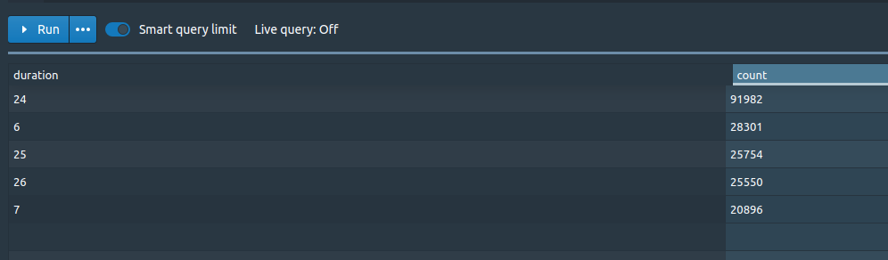 I'm trying to create line chart (same thing happen for all charts). Looks like superset can not create query properly and puts NULL for all values. Here is how I configure chart  Here is how superset generate query ``` SELECT "duration" AS "duration", COUNT(*) AS "count" FROM "druid"."mydatasource" WHERE "__time" >= '2021-03-11 14:24:38.000000' AND "__time" < '2021-03-18 14:24:38.000000' GROUP BY "duration" ORDER BY "count" DESC LIMIT 5; SELECT "duration" AS "duration", TIME_FLOOR("__time", 'PT5M') AS "__timestamp", COUNT(*) AS "count" FROM "druid"."mydatasource" WHERE "__time" >= '2021-03-11 14:24:38.000000' AND "__time" < '2021-03-18 14:24:38.000000' AND ("duration" = NULL OR "duration" = NULL OR "duration" = NULL OR "duration" = NULL OR "duration" = NULL) GROUP BY "duration", TIME_FLOOR("__time", 'PT5M') LIMIT 10000; ``` And this is actual result of first select query on druid  ### Expected results Chart should be generated for selected series ### Actual results No data return ### Environment - superset version: 1.0.1 - python version: 3.7 - druid: 0.20.1 ### Checklist Make sure to follow these steps before submitting your issue - thank you! - [x] I have checked the superset logs for python stacktraces and included it here as text if there are any. - [x] I have reproduced the issue with at least the latest released version of superset. - [x] I have checked the issue tracker for the same issue and I haven't found one similar. ---------------------------------------------------------------- This is an automated message from the Apache Git Service. To respond to the message, please log on to GitHub and use the URL above to go to the specific comment. For queries about this service, please contact Infrastructure at: [email protected] --------------------------------------------------------------------- To unsubscribe, e-mail: [email protected] For additional commands, e-mail: [email protected]