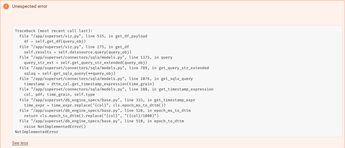 I want to create a chart **Big Number with Trendline** that must use a custom datetime column (different from @timestamp) field from an opendistro dataset    Using the **timestamp** field it gets the error while with the **firstEventEpochSession** it works correctly  ### Expected results Chart is able to render the data ### Actual results & screenshots  #### How to reproduce the bug 1. Create a dataset from an opendistro index (with a custom datetime field) 2. Create a chart of type **Big Number with Trendline** 3. Select the custom datetime field into the time section 4. Run the query & see error ### Environment - helm chart (latest) - superset version: `superset version` ``` root@superset-67bcb48445-hgvw9:/app# superset version Loaded your LOCAL configuration at [/app/pythonpath/superset_config.py] logging was configured successfully INFO:superset.utils.logging_configurator:logging was configured successfully -=-=-=-=-=-=-=-=-=-=-=-=-=-=-= Superset 0.999.0dev -=-=-=-=-=-=-=-=-=-=-=-=-=-=-= ``` - python version: `python --version` ``` root@superset-67bcb48445-hgvw9:/app# python Python 3.7.9 (default, Feb 9 2021, 08:33:04) [GCC 8.3.0] on linux ``` ### Checklist Make sure to follow these steps before submitting your issue - thank you! - [x] I have checked the superset logs for python stacktraces and included it here as text if there are any. - [x] I have reproduced the issue with at least the latest released version of superset. - [x] I have checked the issue tracker for the same issue and I haven't found one similar. ### Superset source code https://github.com/apache/superset/blob/9fa52b50edaa2e42b7d064139ddb41d329aa1344/superset/db_engine_specs/base.py#L502 https://github.com/apache/superset/blob/9fa52b50edaa2e42b7d064139ddb41d329aa1344/superset/db_engine_specs/elasticsearch.py#L67 -- This is an automated message from the Apache Git Service. To respond to the message, please log on to GitHub and use the URL above to go to the specific comment. For queries about this service, please contact Infrastructure at: [email protected] --------------------------------------------------------------------- To unsubscribe, e-mail: [email protected] For additional commands, e-mail: [email protected]