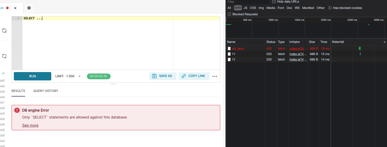 ### SUMMARY <!--- Describe the change below, including rationale and design decisions --> With generic db errors we'll be returning 422 instead of 500  ### BEFORE/AFTER SCREENSHOTS OR ANIMATED GIF <!--- Skip this if not applicable --> ### TEST PLAN <!--- What steps should be taken to verify the changes --> 1. Goto sql lab 2. Write malformed query 3. Check network tab for `sql_json` to be 422 instead of 500 ### ADDITIONAL INFORMATION <!--- Check any relevant boxes with "x" --> <!--- HINT: Include "Fixes #nnn" if you are fixing an existing issue --> - [ ] Has associated issue: - [ ] Changes UI - [ ] Requires DB Migration. - [ ] Confirm DB Migration upgrade and downgrade tested. - [ ] Introduces new feature or API - [ ] Removes existing feature or API -- This is an automated message from the Apache Git Service. To respond to the message, please log on to GitHub and use the URL above to go to the specific comment. For queries about this service, please contact Infrastructure at: [email protected] --------------------------------------------------------------------- To unsubscribe, e-mail: [email protected] For additional commands, e-mail: [email protected]