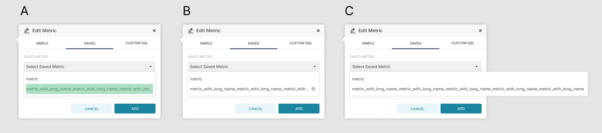 Some other solutions in addition to full width dropdown:  A - The hover area is the whole menu item B - The (i) persists and we truncate just a few characters earlier C - Full width dropdown (@ktmud) I like A since users it won't demand much user precision to view the entire metric name. C might create awkward looking lists with a lot of white space if there's a large variance between metric character lengths. I also think that the resize icon shifts the buttons to a pretty awkward alignment. Resize cursors on the edge should suffice to indicate that the popover can be enlarged. Also unsure if there's a need for vertical resizing.  -- This is an automated message from the Apache Git Service. To respond to the message, please log on to GitHub and use the URL above to go to the specific comment. For queries about this service, please contact Infrastructure at: [email protected] --------------------------------------------------------------------- To unsubscribe, e-mail: [email protected] For additional commands, e-mail: [email protected]