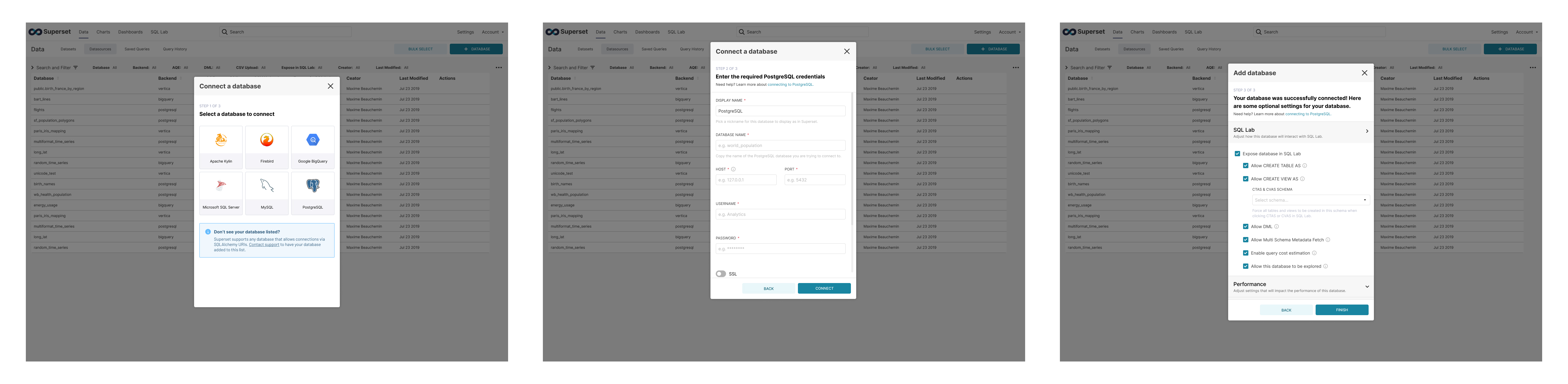 This mock introduces a UX update to the add database flow. The following updates have been introduced: 1. Users can select a database from a grid/list of available databases (installed db drivers) 2. A dynamic form will appear displaying all of the required fields for the specific database selected. The SQLAlchemy URI path is still available. The user may choose to connect a db using either the dynamic form _or_ the SQLAlchemy URI. 3. Once the user successfully completes the required fields and connects the db, they have the option to adjust any additional/optional fields before completing the process. The motivation for this design includes some of the following: 1. There is no way a user knows what databases are currently supported when adding a new database until they try to connect and get an error that the driver is missing. 2. What fields are required versus optional are vague. Different databases have different requirements. Some may only require a URI while others might require additional information found in other tabs not currently marked w the required asterisk(*). Here were some of the design goals: 1. Respect the user's time and attention _ make the form as short and simple as possible_ 2. Minimize the number of form inputs _avoid asking other user to do unnecessary work_ 3. Indicate what is required and what is optional _indicate what fields must be filled out as courtesy and to prevent usability errors_ -- This is an automated message from the Apache Git Service. To respond to the message, please log on to GitHub and use the URL above to go to the specific comment. For queries about this service, please contact Infrastructure at: [email protected] --------------------------------------------------------------------- To unsubscribe, e-mail: [email protected] For additional commands, e-mail: [email protected]
