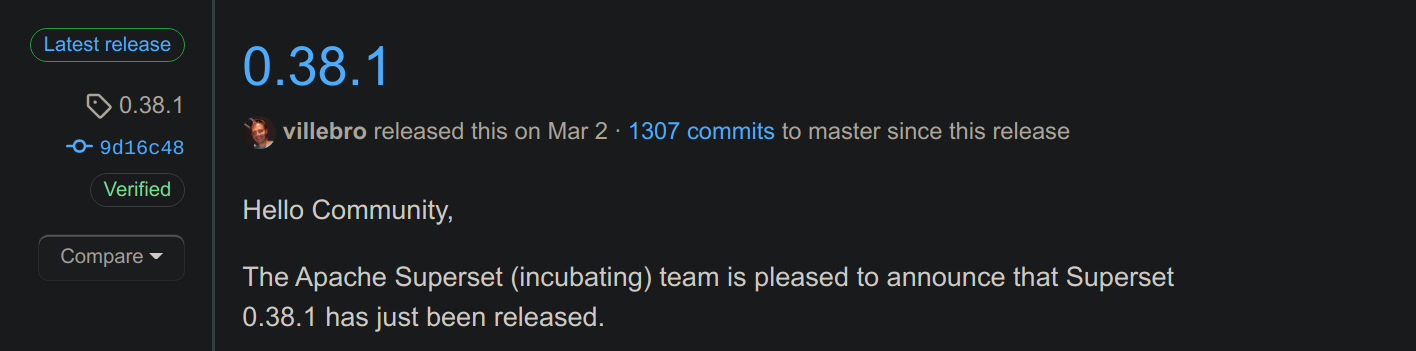 How is `1.0.1` the latest release if the repo clearly shows `0.38.1` to be the latest release?  -- This is an automated message from the Apache Git Service. To respond to the message, please log on to GitHub and use the URL above to go to the specific comment. For queries about this service, please contact Infrastructure at: [email protected] --------------------------------------------------------------------- To unsubscribe, e-mail: [email protected] For additional commands, e-mail: [email protected]