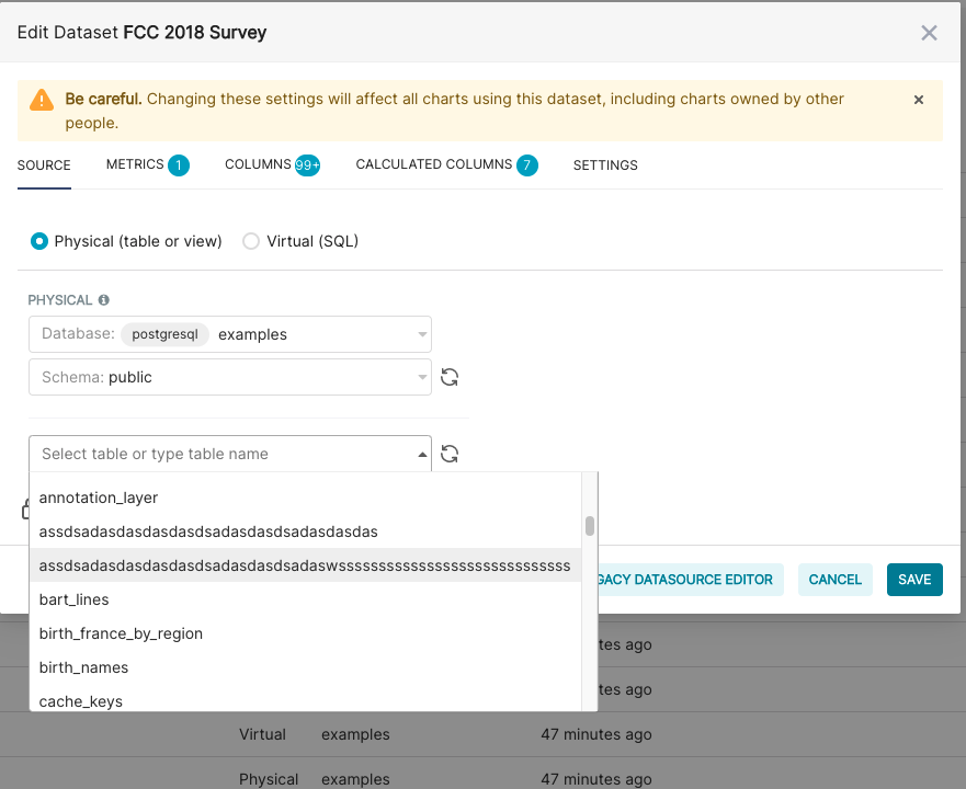 @ktmud I can definitely change the rounded corners and the caret change. For the expanded table names, we could also enable overflow-x so that there is a scroll inside the menu? @Steejay what do you think? Having the auto expanding table breaks other portions that use the same table.  -- This is an automated message from the Apache Git Service. To respond to the message, please log on to GitHub and use the URL above to go to the specific comment. For queries about this service, please contact Infrastructure at: [email protected] --------------------------------------------------------------------- To unsubscribe, e-mail: [email protected] For additional commands, e-mail: [email protected]