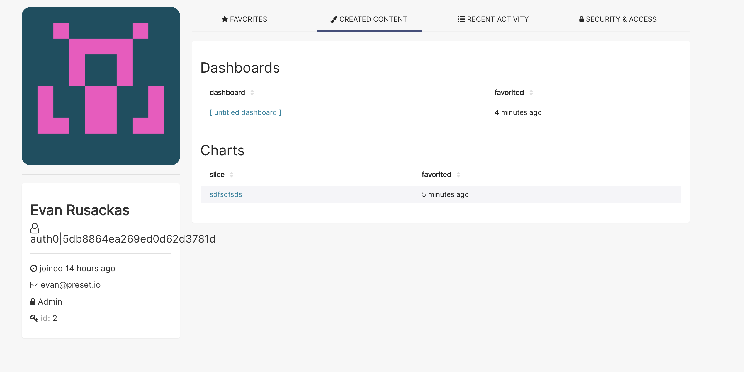 ## Screenshot  ## Description On the Profile page, the "Created Content" tab shows my newly created Dashboard/Chart objects (hooray!) but it also lists their creation time under a "favorited" header. I never "favorited" these objects, so I'm under the assumption that the header should instead say "created". ## Design input [describe any input/collaboration you'd like from designers, and tag accordingly. For design review, add the label `design:review`. If this includes a design proposal, include the label `design:suggest`] -- This is an automated message from the Apache Git Service. To respond to the message, please log on to GitHub and use the URL above to go to the specific comment. For queries about this service, please contact Infrastructure at: [email protected] --------------------------------------------------------------------- To unsubscribe, e-mail: [email protected] For additional commands, e-mail: [email protected]