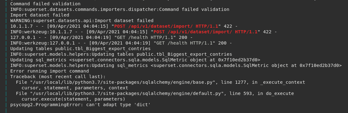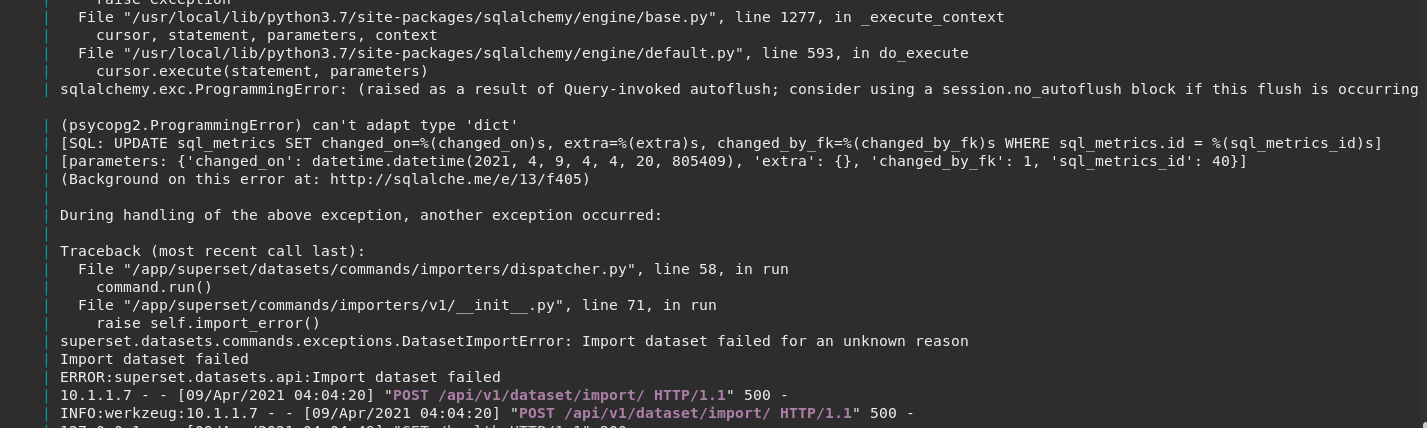 If datasets has a dict in yaml file - metrics: extra - that cause the unknown error when import datasets using UI.  ### Actual results Failed import datasets #### Screenshots  Server log   #### How to reproduce the bug 1. Edit any Virtual datasets 2. Click on Metrics tab 3. Click on "Add Item" - create any new item - or even add item and click delete - it also create dict in extra field. 4. Save datasets 5. Click on Action - Export 6. Click Import - choose zip file previously exported 7. enter "OVERWRITE" 8. See error ### Environment - superset version: `superset version 1.0.1` - docker-compose-non-dev.yml ### Additional context If change dict to null in yaml file - import works as expected. -- This is an automated message from the Apache Git Service. To respond to the message, please log on to GitHub and use the URL above to go to the specific comment. For queries about this service, please contact Infrastructure at: [email protected] --------------------------------------------------------------------- To unsubscribe, e-mail: [email protected] For additional commands, e-mail: [email protected]