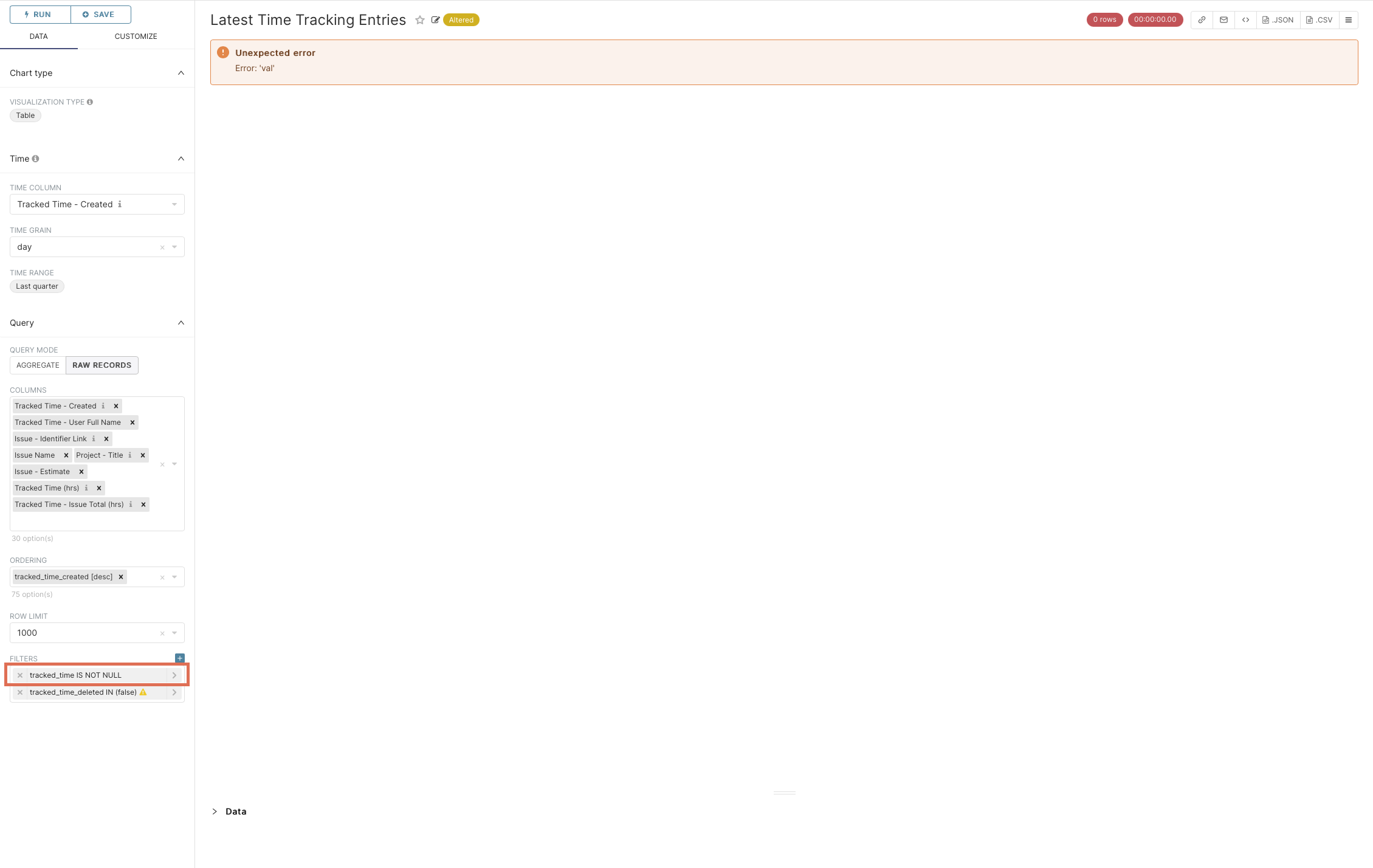 The error is resolved by removing "IS NOT NULL" condition from the filters. The chart worked just fine before the update.  -- This is an automated message from the Apache Git Service. To respond to the message, please log on to GitHub and use the URL above to go to the specific comment. For queries about this service, please contact Infrastructure at: [email protected] --------------------------------------------------------------------- To unsubscribe, e-mail: [email protected] For additional commands, e-mail: [email protected]