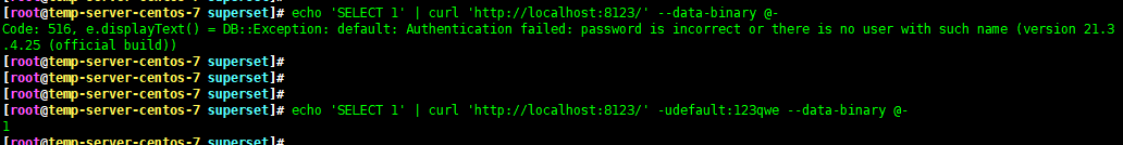 sorry, I use a wrong linux command to test, the correct is: ``` echo 'SELECT 1' | curl 'http://localhost:8123/' -udefault:123qwe --data-binary @- ```  -- This is an automated message from the Apache Git Service. To respond to the message, please log on to GitHub and use the URL above to go to the specific comment. For queries about this service, please contact Infrastructure at: [email protected] --------------------------------------------------------------------- To unsubscribe, e-mail: [email protected] For additional commands, e-mail: [email protected]