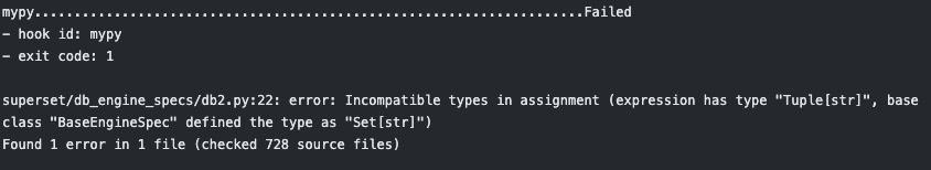 ### SUMMARY According to mypy, this should be a set, not a tuple ### BEFORE/AFTER SCREENSHOTS OR ANIMATED GIF  ### TEST PLAN CI ### ADDITIONAL INFORMATION <!--- Check any relevant boxes with "x" --> <!--- HINT: Include "Fixes #nnn" if you are fixing an existing issue --> - [ ] Has associated issue: - [ ] Changes UI - [ ] Includes DB Migration (follow approval process in [SIP-59](https://github.com/apache/superset/issues/13351)) - [ ] Migration is atomic, supports rollback & is backwards-compatible - [ ] Confirm DB migration upgrade and downgrade tested - [ ] Runtime estimates and downtime expectations provided - [ ] Introduces new feature or API - [ ] Removes existing feature or API to: @villebro @suddjian @john-bodley -- This is an automated message from the Apache Git Service. To respond to the message, please log on to GitHub and use the URL above to go to the specific comment. For queries about this service, please contact Infrastructure at: [email protected] --------------------------------------------------------------------- To unsubscribe, e-mail: [email protected] For additional commands, e-mail: [email protected]