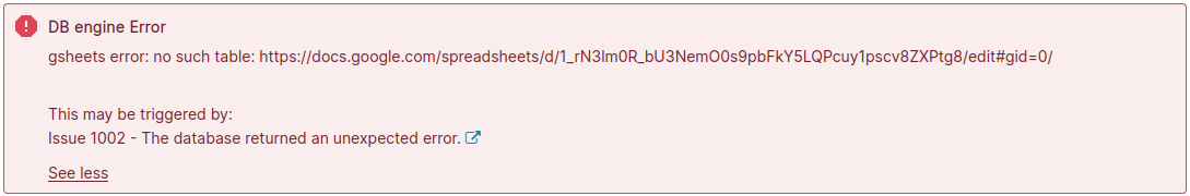 Hello, Following [this tutorial on Preset blog](https://preset.io/blog/2020-06-01-connect-superset-google-sheets/), I managed to connect to the example spreadsheet, as well as my own ones, with simple queries via the SQL editor as ```sql SELECT * FROM "https://docs.google.com/spreadsheets/d/1_rN3lm0R_bU3NemO0s9pbFkY5LQPcuy1pscv8ZXPtg8/edit#gid=0" ``` I got the results correctly returned. But every time I try to "Explore" my dataset then, I get the following error `no such table`:  When I try to build a bar chart, as suggested in the tutorial, I noticed that the query Superset was applying was : ```sql SELECT country AS country, COUNT(*) AS count FROM "https://docs.google.com/spreadsheets/d/1_rN3lm0R_bU3NemO0s9pbFkY5LQPcuy1pscv8ZXPtg8/edit#gid=0" GROUP BY country ORDER BY count DESC LIMIT 10000 ``` I indeed have the same error when reproducing that query in the SQL editor. But I don't have error anymore if I just query without the `ORDER BY` statement! and my results are correctly displayed. Any idea on how to deal with this trouble to be able to visualize my data from Gsheets? I'm using Superset version 1.0.1, let me know if you need more information about the setup. Thanks in advance for helping, Pauline -- This is an automated message from the Apache Git Service. To respond to the message, please log on to GitHub and use the URL above to go to the specific comment. For queries about this service, please contact Infrastructure at: [email protected] --------------------------------------------------------------------- To unsubscribe, e-mail: [email protected] For additional commands, e-mail: [email protected]