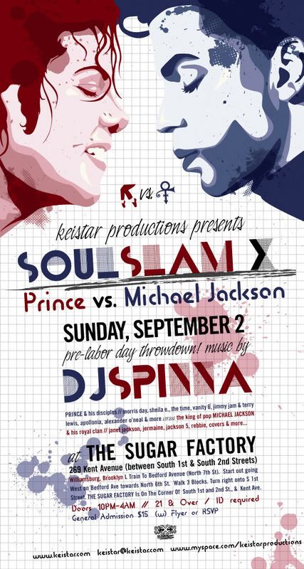 SOUL SLAM (X) Pre-Labor Day ThrowDown! Prince vs. Michael Jackson THE PRINCE & HIS DISCIPLES *Morris Day, Sheila E., The Time, Vanity 6, Jimmy Jam & Terry Lewis, Apolonia, Alexander O'Neal & More...* vs. THE KING OF POP MJ & HIS ROYAL CLAN *Janet Jackson, Jermaine, J5, Rebbie, MJ Covers & More...* Music By DJ SPINNA @ THE SUGAR FACTORY 269 Kent Avenue (Bet. South 1st & South 2nd Streets - Williamsburg, Bklyn NY-11211) Doors 10PM-4AM / Admission $15 (w) Flyer or RSVP / 21& Over - ID Required RSVP [EMAIL PROTECTED] View flyer here > http://i41.photobucket.com/albums/e273/keitap/SS-9.07.jpg Directions By Train: L Train To Bedford Avenue (North 7th St). Start out going West on Bedford Ave towards North 6th St . Walk 3 Blocks. Turn right onto S 1st Street. MAPQUEST for Driving Directions. THE SUGAR FACTORY Is On The Corner Of South 1st and 2nd St., & Kent Ave. Located in the hip Williamsburg section of Brooklyn, across from the old Domino's sugar factory, the brand new THE SUGAR FACTORY is a 14,000 sq ft multi level entertainment venue. -- Keita *:::*:::*:::*:::*:::*:::*:::* KeiStar Productions www.myspace.com/keistarproductions ------------------------------------------------------------------------- NewPowerNewYork Mailing List website: Www.NPNY.Org ------------------------------------------------------------------------- Unsubscribe? Email: [EMAIL PROTECTED], in body place npny ------------------------------------------------------------------------- Questions/Help?: [EMAIL PROTECTED]